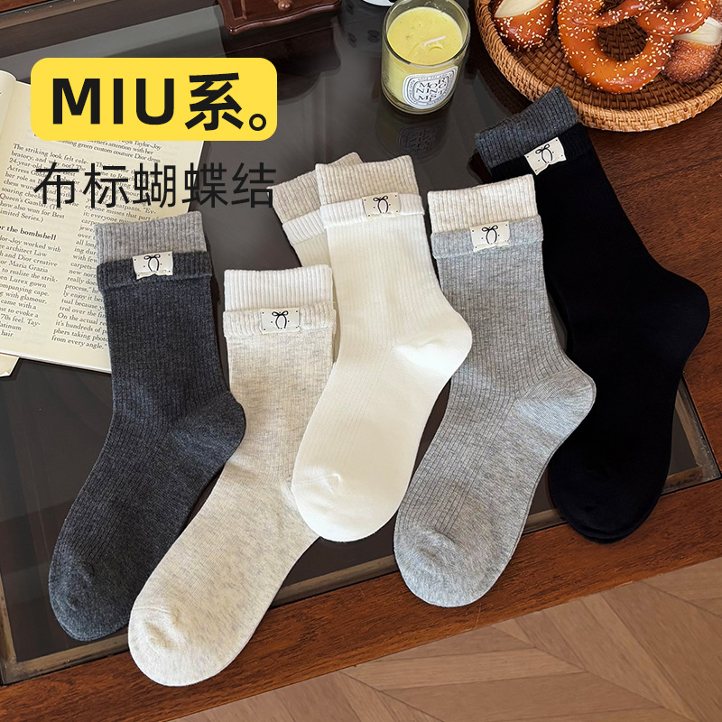 秋季新款布标蝴蝶结女士MIU系袜子棉质吸汗透气中筒袜ins风女袜子