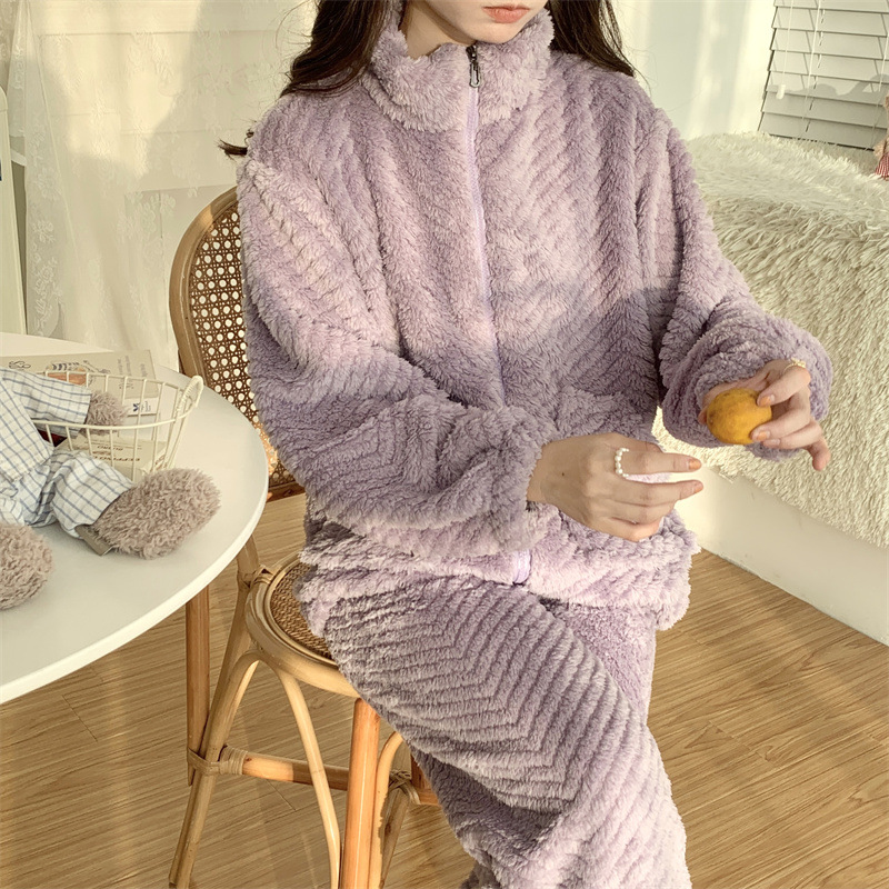 パジャマの女性の秋の冬の厚いサンゴの絨毯2024の新型の高級感のファスナーの高襟の紫色はスーツを着ることができます。