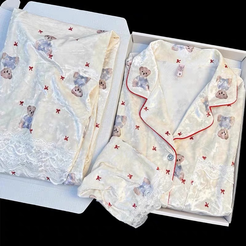 金丝绒保暖睡衣女秋冬新款圆领开衫长袖长裤少女国风家居服两件套