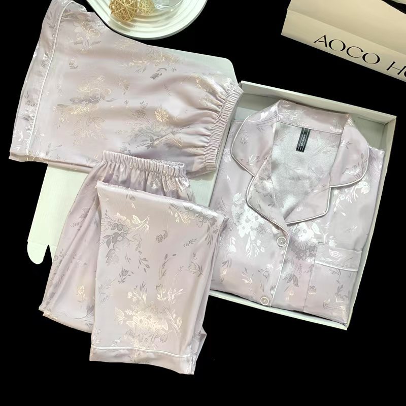 雪絹新中式風高級感パジャマ女性用2025新作春秋長袖雪絹ホームウェアセット