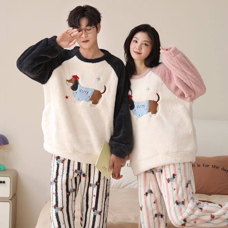 カップルパジャマ女性秋冬金2024保温サンゴベルベット丸首長袖ベルベット厚手ホームウェア男性スーツ