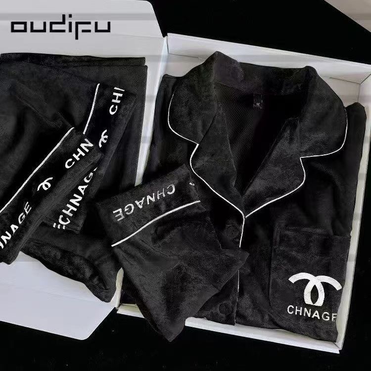 2024文字の軽い贅沢な小さな香りのベルベットのパジャマ女性秋冬の長袖の金ドリルのベルベットの家の服のスーツは生放送します