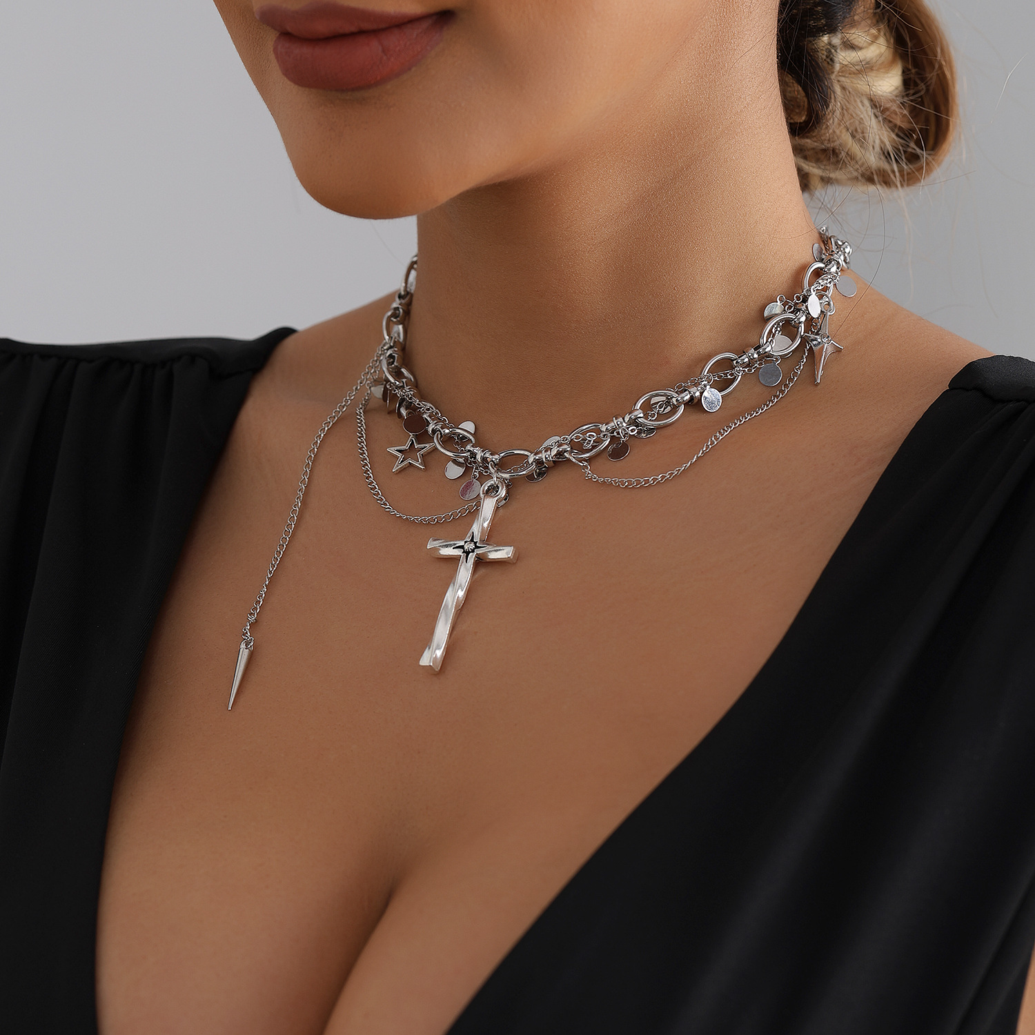 欧美跨境饰品猪鼻圆片金属流苏十字架项链女 轻奢时尚风缠绕项饰