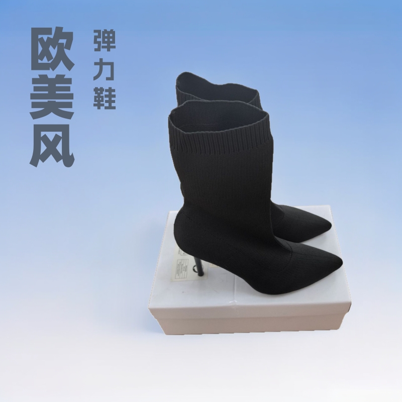 欧美风外贸大码高跟鞋针织短靴2025网红尖头瘦瘦靴子新款弹力靴