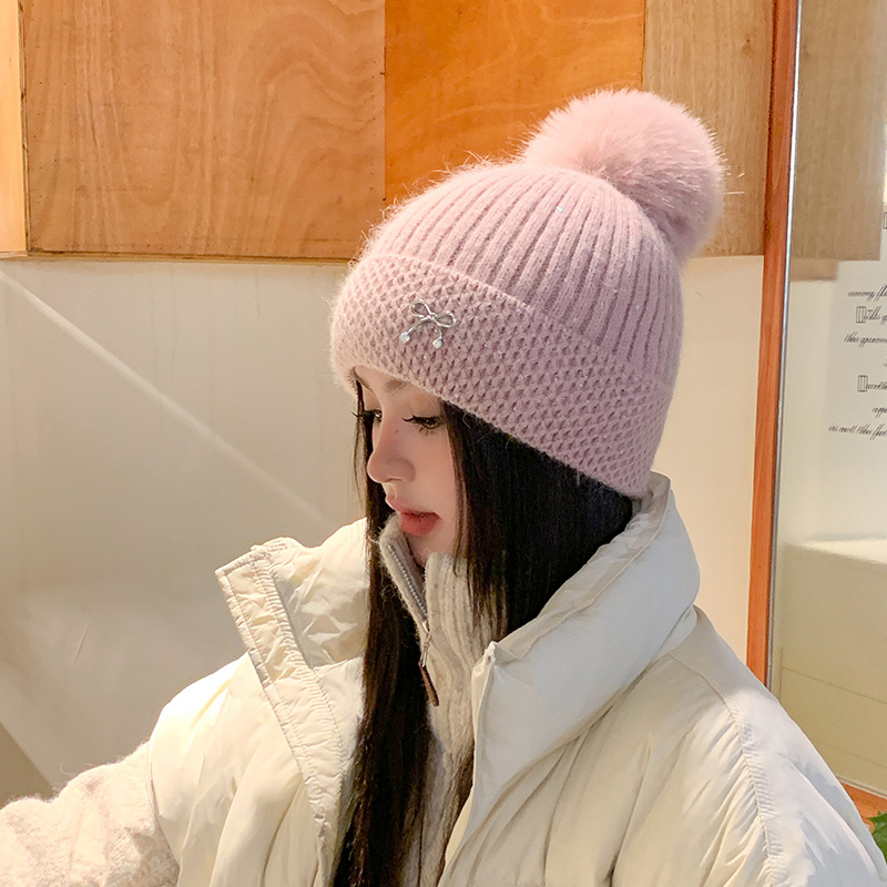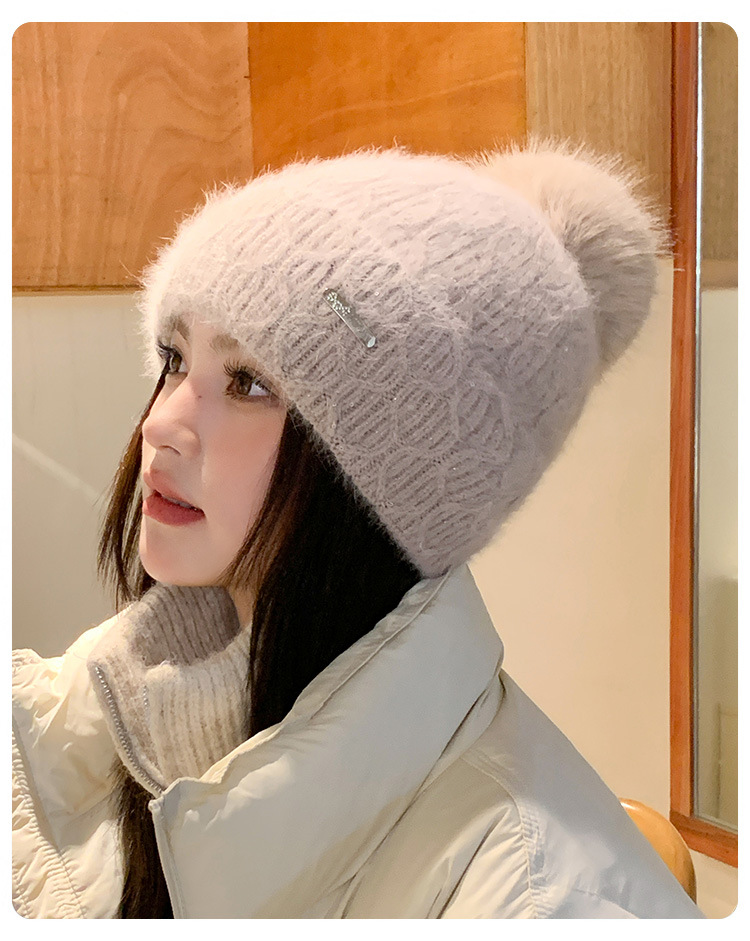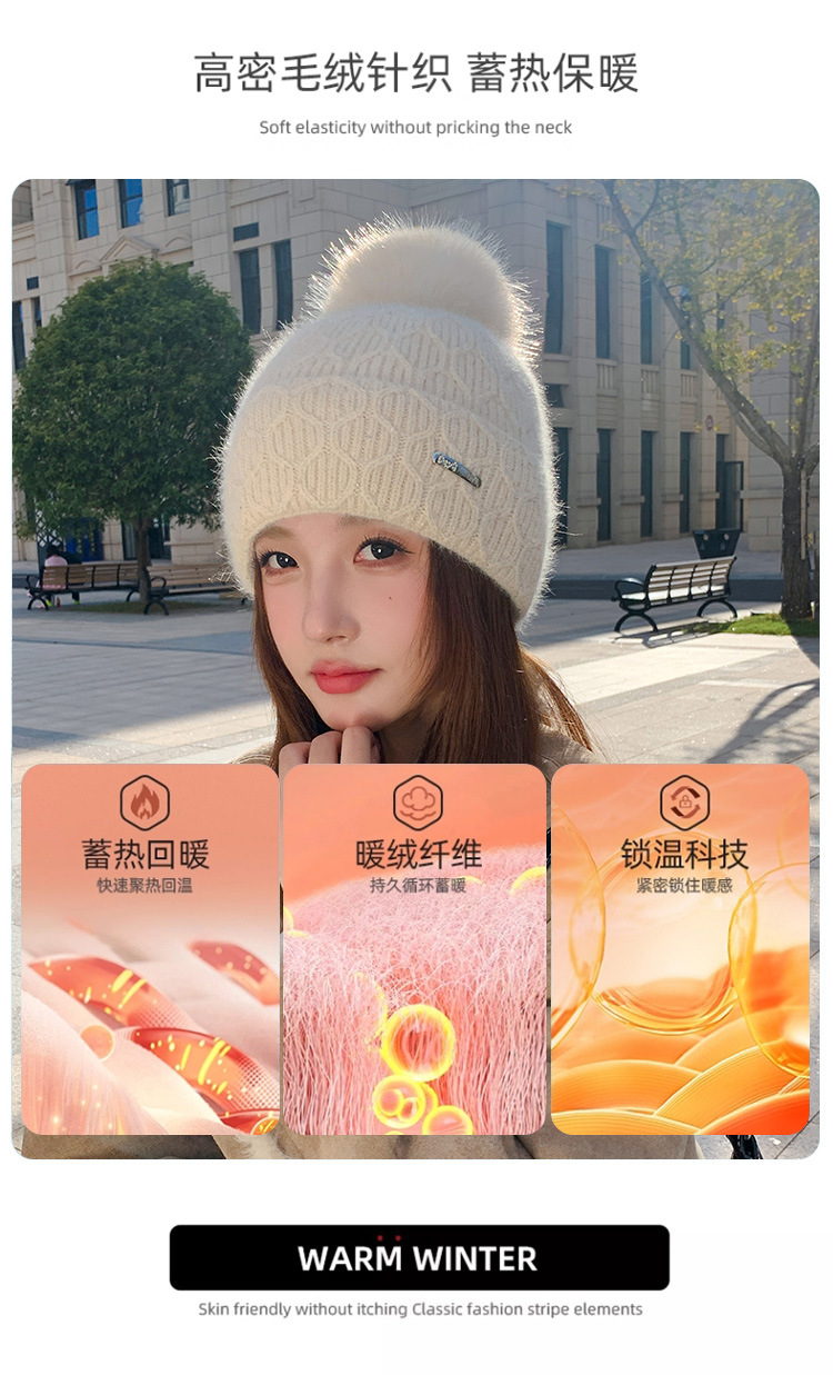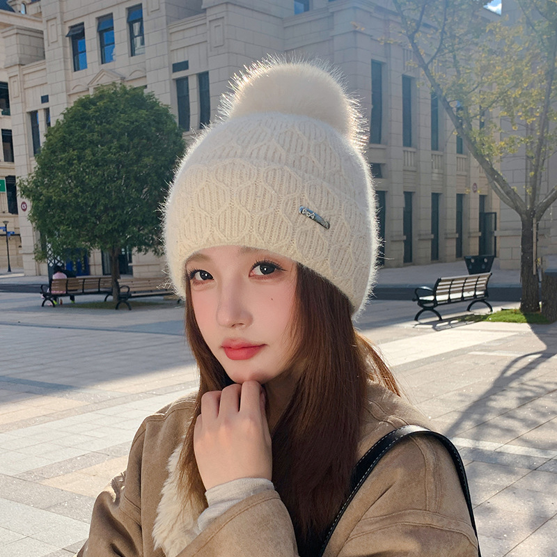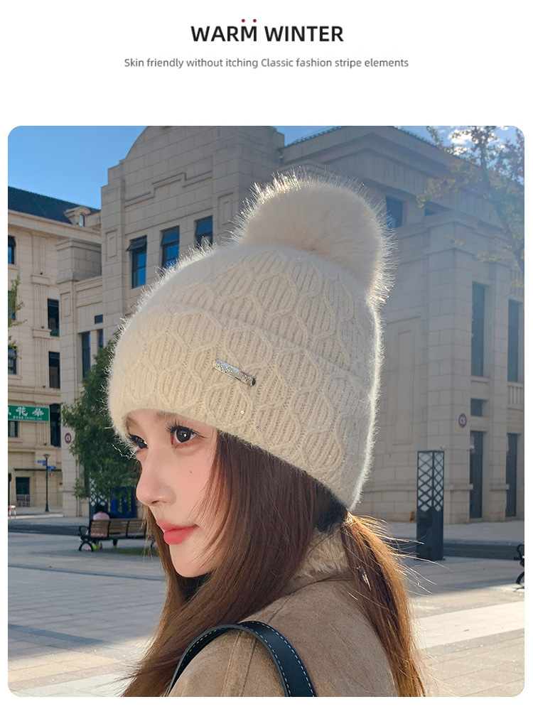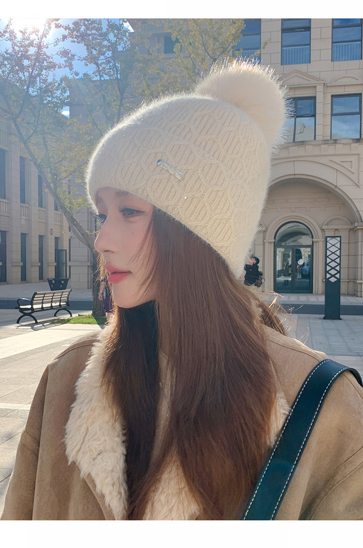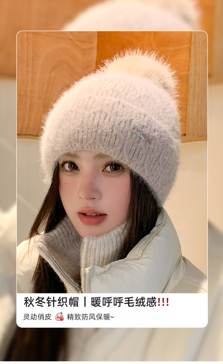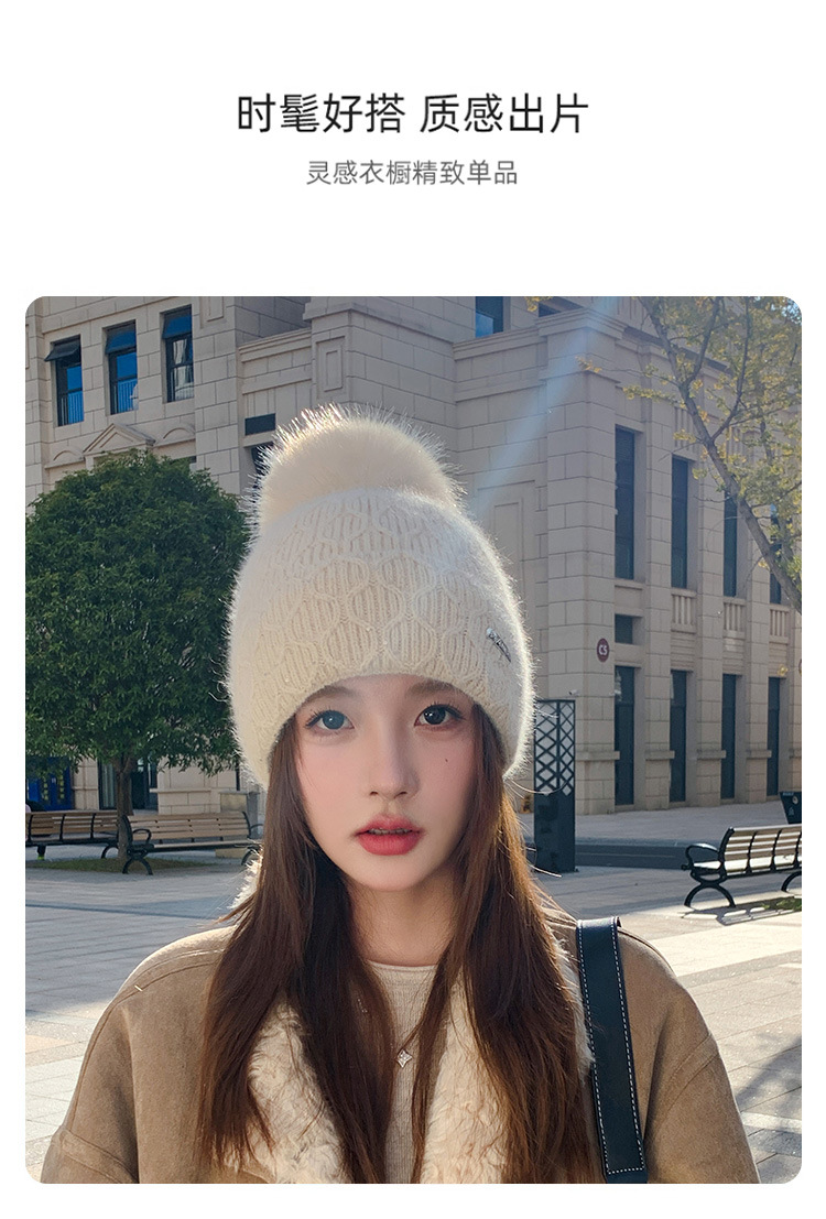 可爱减龄兔毛针织帽大毛球加厚保暖毛线帽子女冬季休闲百搭加绒潮