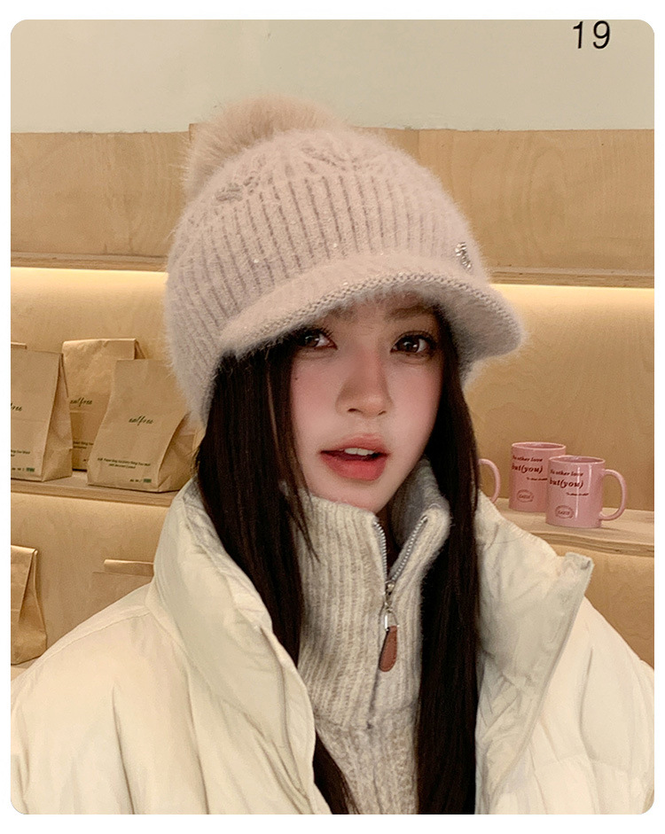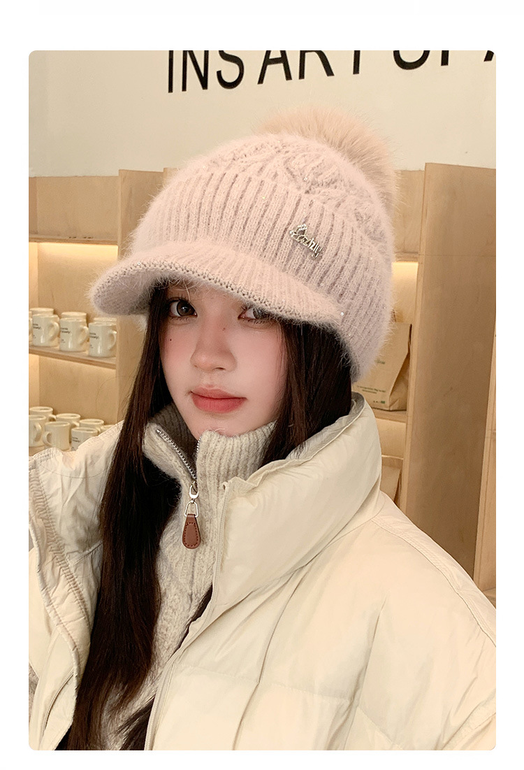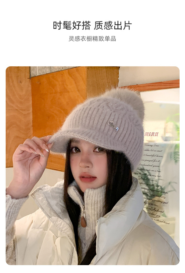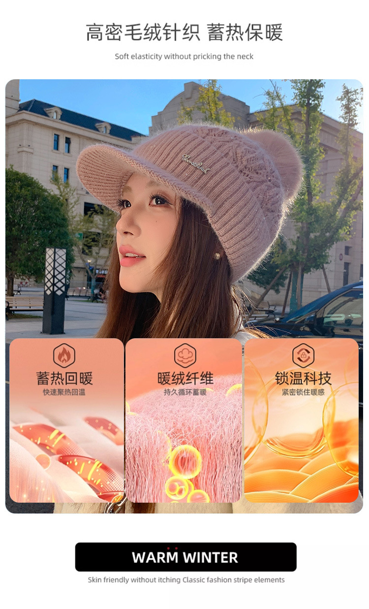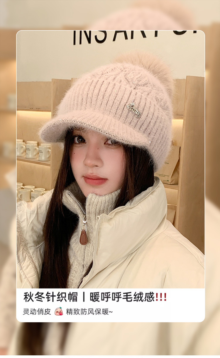 冬季新款鸭舌毛线帽女加厚保暖护耳毛球针织帽逛街骑车防寒帽子潮