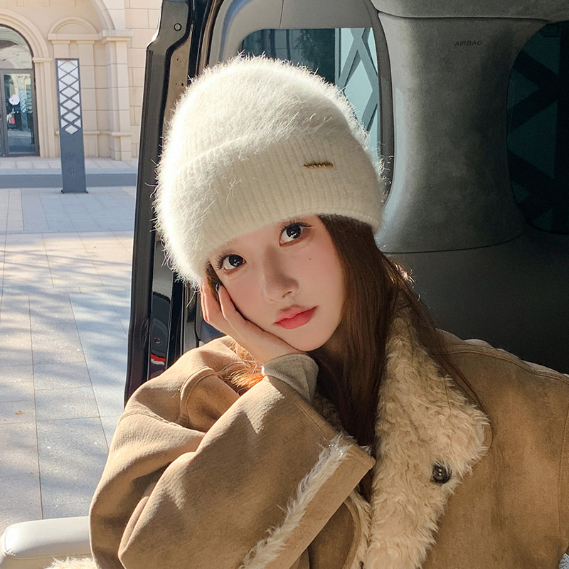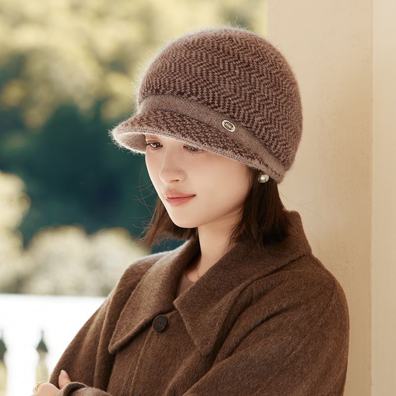新款兔毛针织帽女韩版时尚提花百搭毛线帽秋冬加绒保暖护耳鸭舌帽