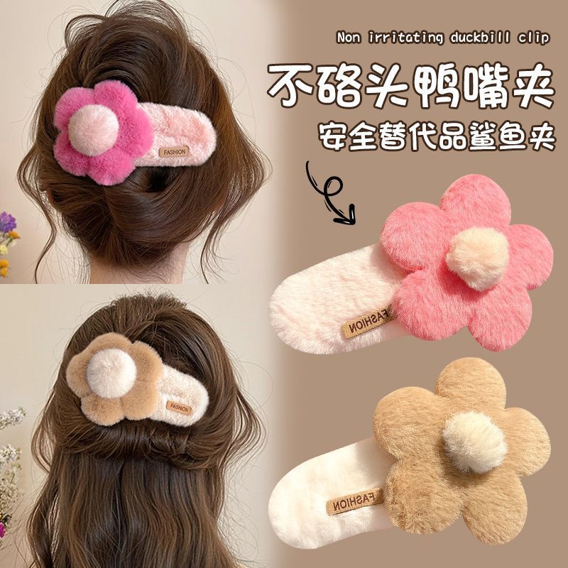 可爱毛绒花朵发夹女后脑勺夹子大号发卡秋冬鸭嘴夹盘发一字夹头饰