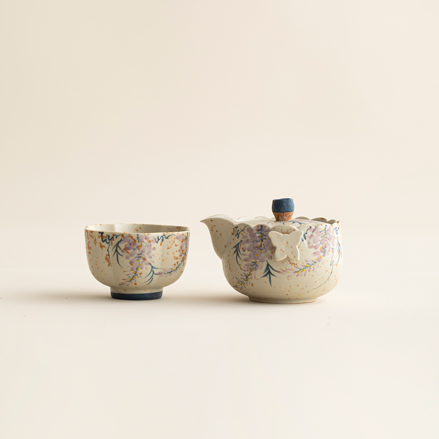 焦糖釉手绘紫藤花手抓茶壶茶杯陶瓷家用一壶一杯套组