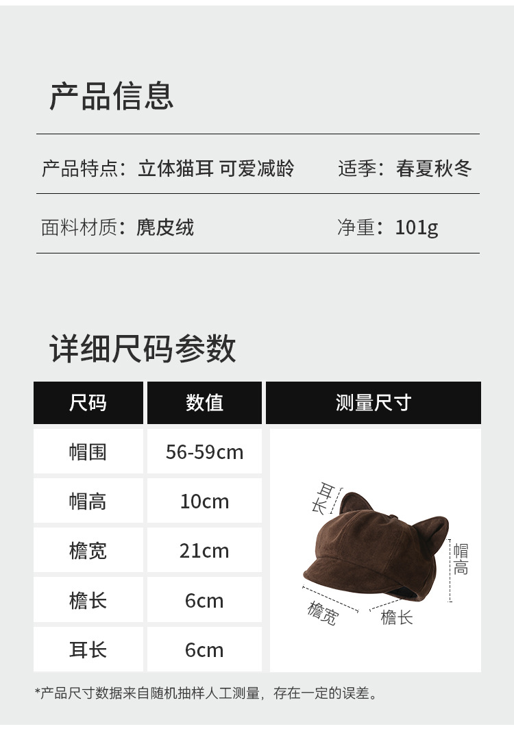 复古麂皮绒猫耳朵贝雷帽女秋冬季显脸小八角帽休闲百搭画家帽子潮