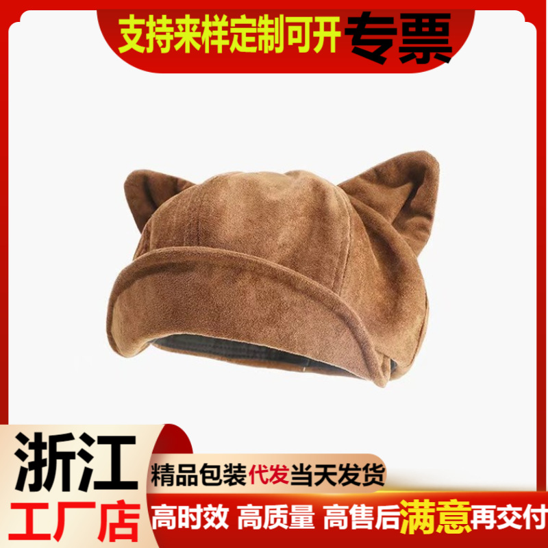 2025新款可爱猫咪耳朵灯芯绒八角帽子女秋冬保暖百搭贝雷帽显脸小