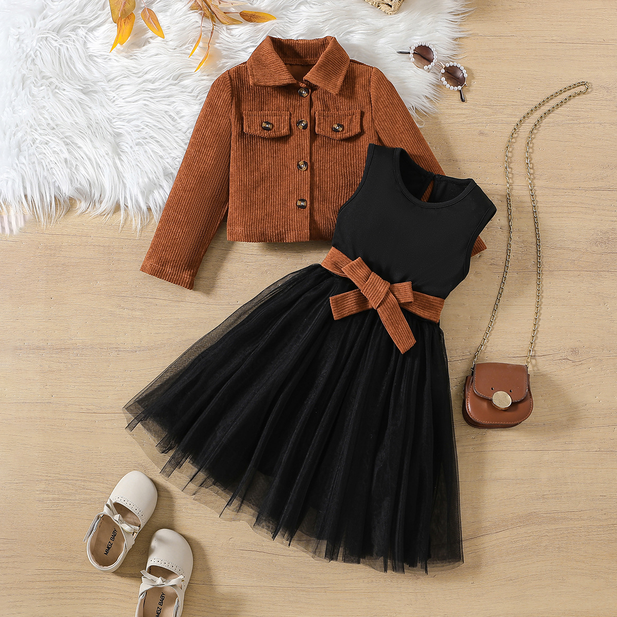 女の子のスタイリッシュでエレガントなツーピースセット: フェイクポケットラペルコーデュロイ長袖コート + ベストふわふわメッシュスカート