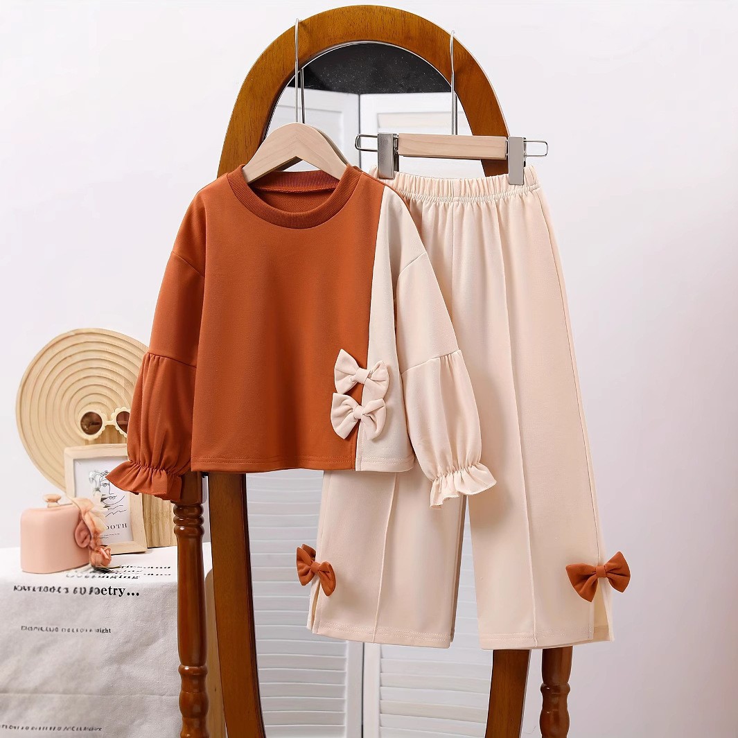 新しい女の子の服、対照的な色、ファッショナブルなツーピースベビー春リボンカジュアルパッチワークスウェットシャツカジュアル