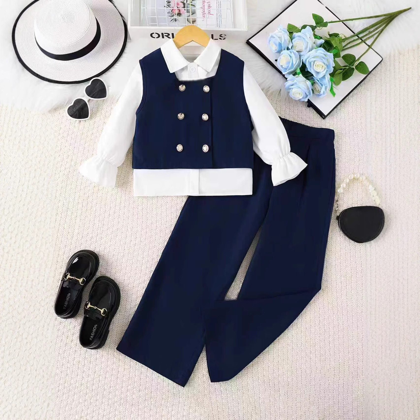 外贸儿童西服三件套深蓝色马甲白色长袖衬衫西裤英伦风女童套装