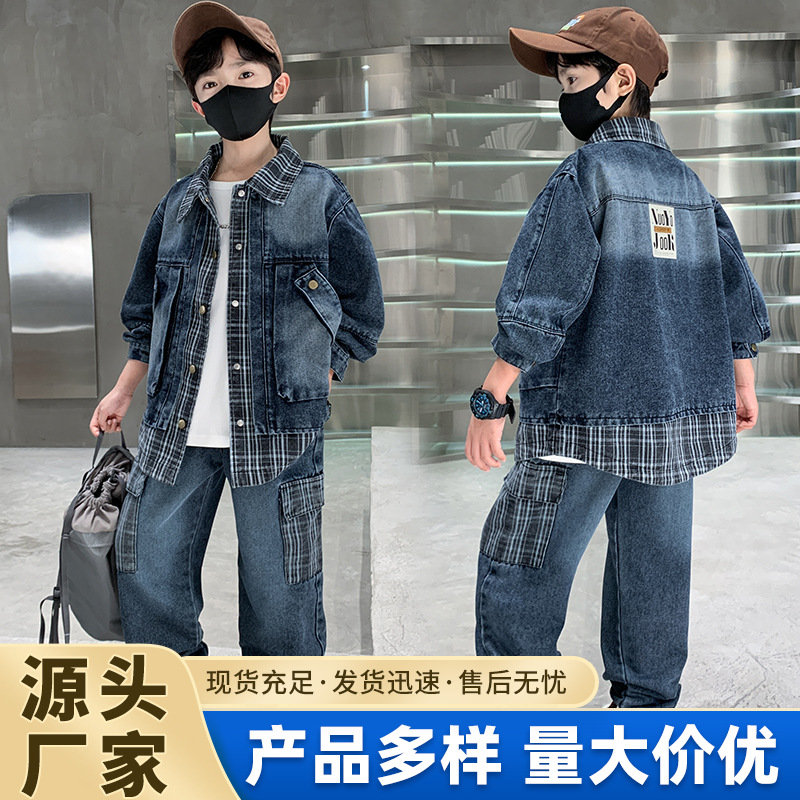 男童春秋洋气百搭格子牛仔套装2026新款中大童韩版潮流假两件套装