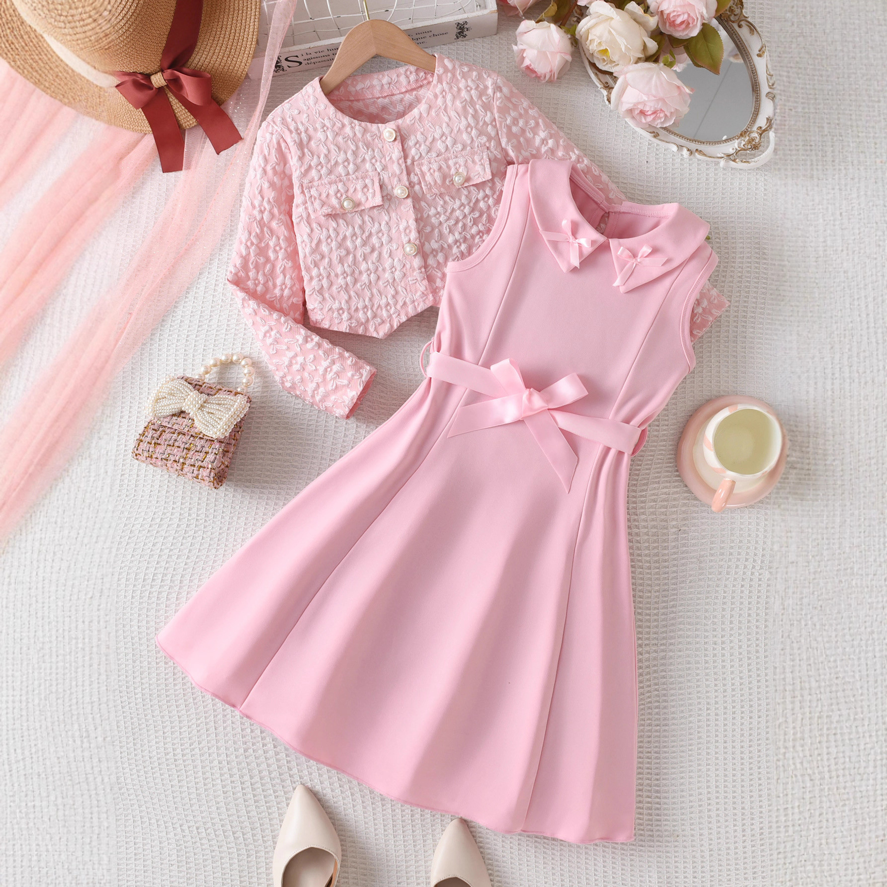 跨境女童两件套粉色提花开衫珍珠扣蝴蝶结领连衣裙秋季套装新品