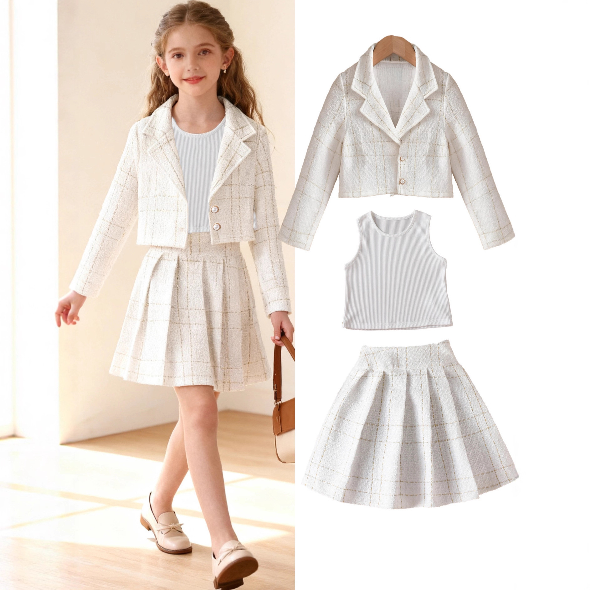 欧美女童小香风三件套装裙春秋新款儿童时尚洋气外套背心半身裙