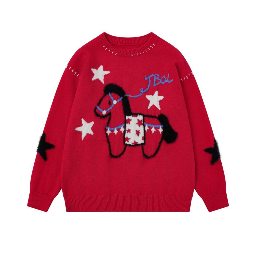 2026年新款红色卡通马年毛衣秋冬新款潮流宽松情侣圆领针织衫男女