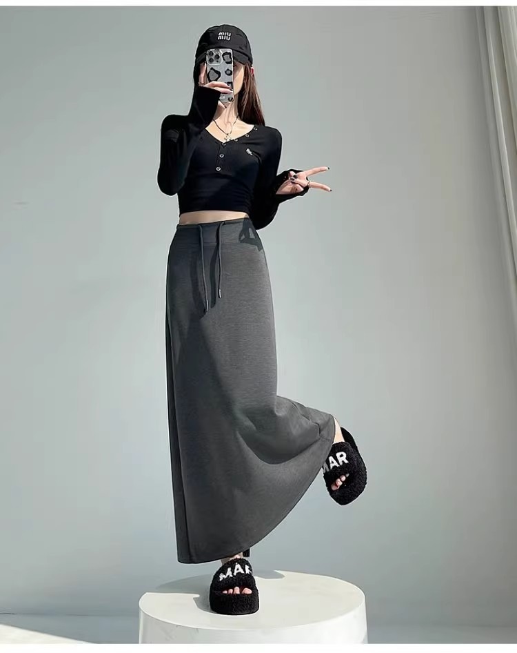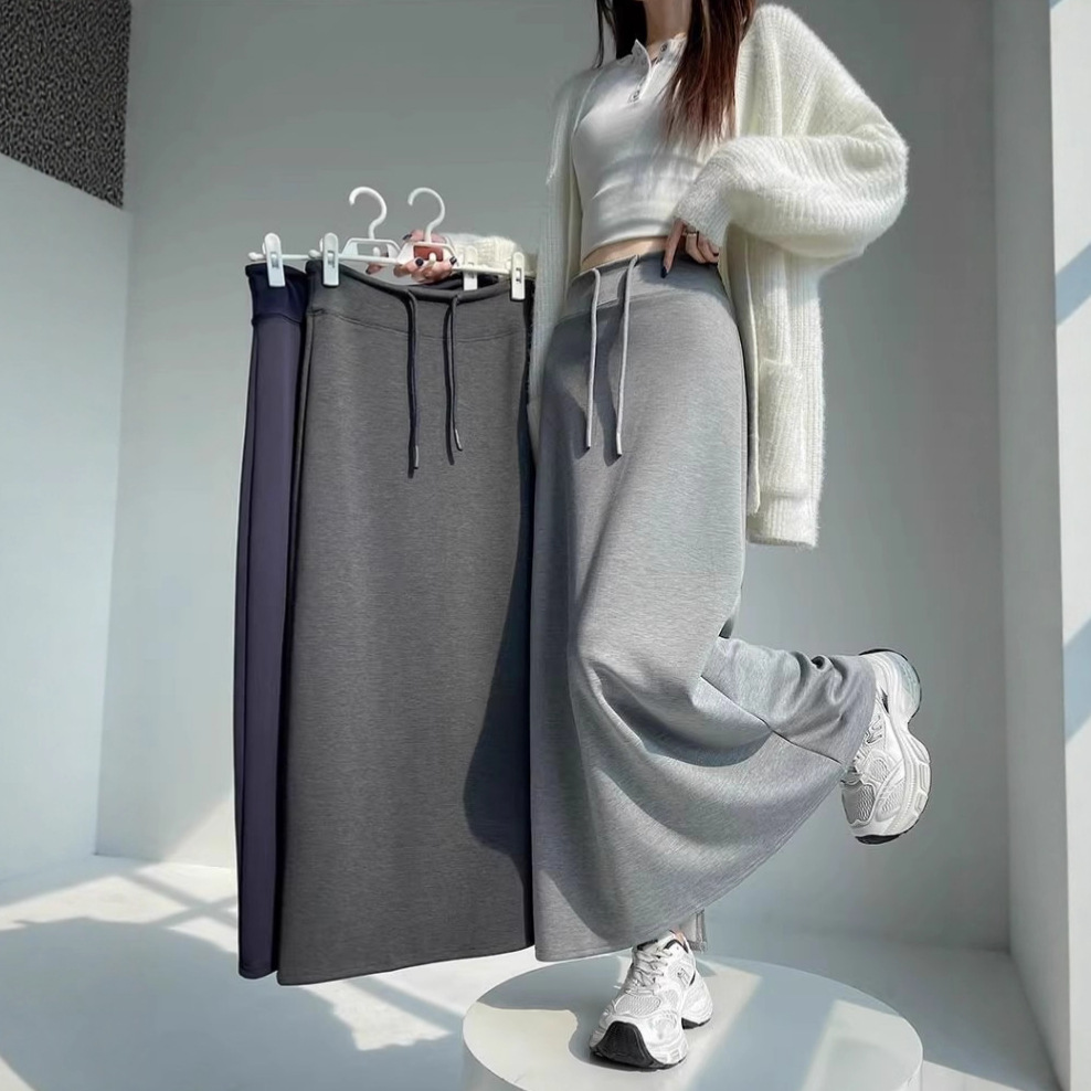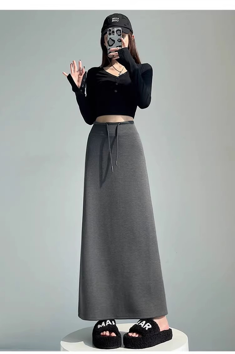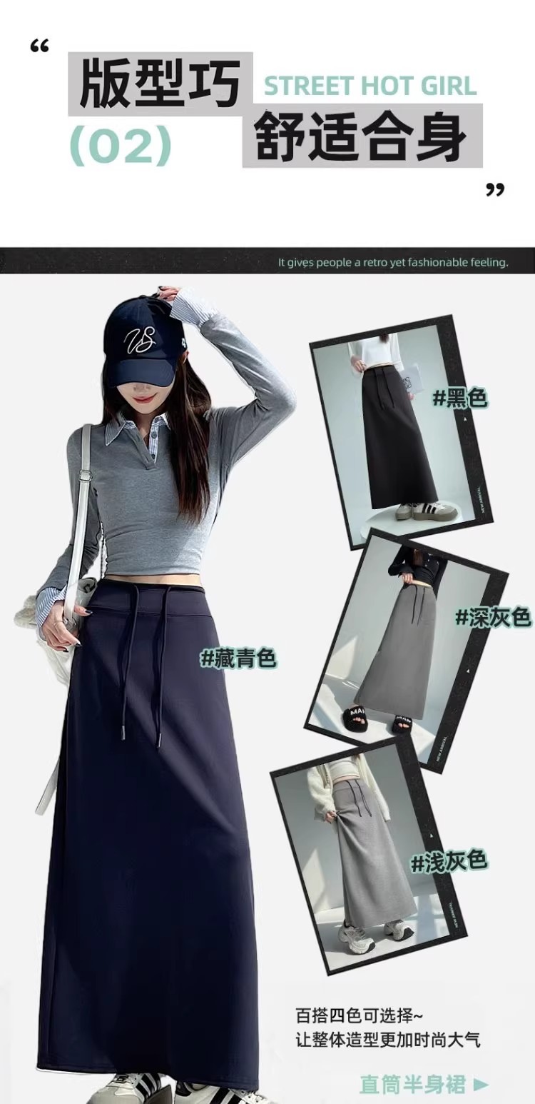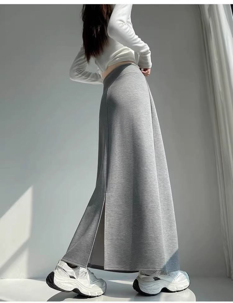 灰色运动半身裙女春秋新款高腰直筒开叉a字半裙垂坠感卫裙长裙子