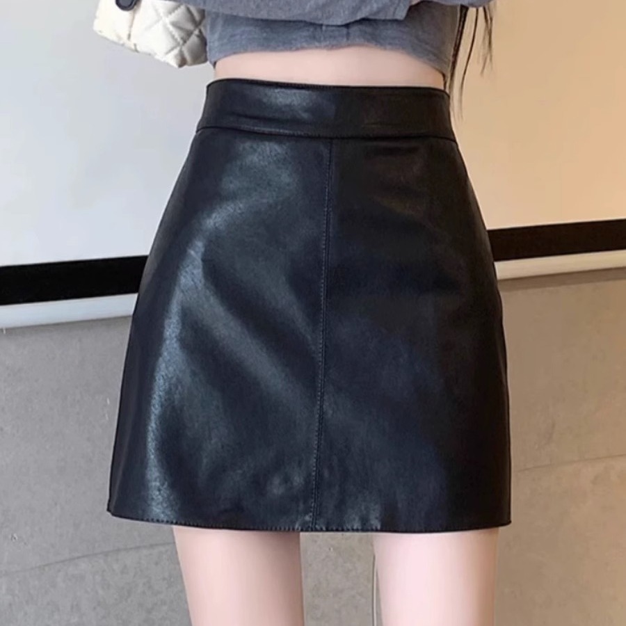 黒い皮のスカートの女性の秋冬の高腰はやせています。