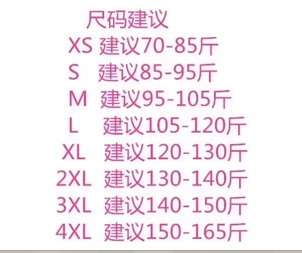尺码 S【建议86-96斤】,M【建议97-107斤】,L【建议108-119斤】,XL【建议120-130斤】,2XL【建议130-140斤】,3XL【建议140-155斤】,4XL【建议155-165斤】,5XL