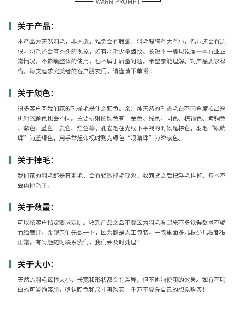 颜色 25-30cm小眼,25-30cm孔雀羽毛,25-30cm精品大眼,40-50cm小眼,40-50cm孔雀羽毛,40-50cm精品大眼,60-70cm孔雀羽毛,70-80cm孔雀羽毛,80-90cm孔雀羽毛,90-100cm孔雀羽毛,100-110cm孔雀羽毛,110-120cm孔雀羽毛,孔雀金片,孔雀蓝片,30-40cm孔雀边毛,孔雀丝一捆,孔雀丝一公斤