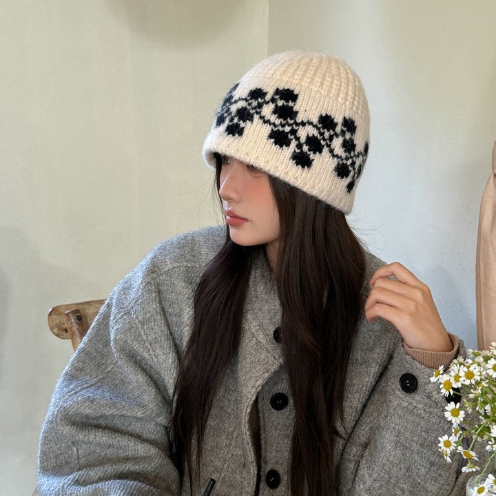 韩版秋冬保暖毛线帽子女时尚百搭显脸小花朵针织帽大头围包头冷帽