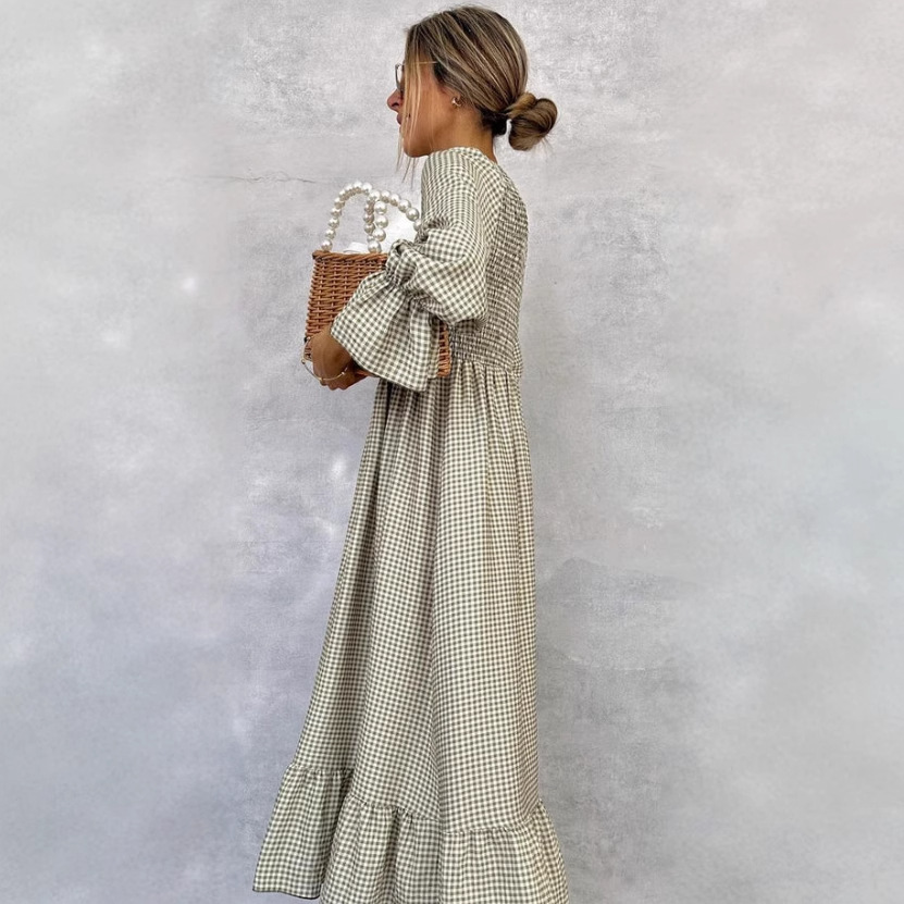 2025欧美女装 独立站 数码印花 格纹 V领长袖 荷叶边连衣裙 长裙