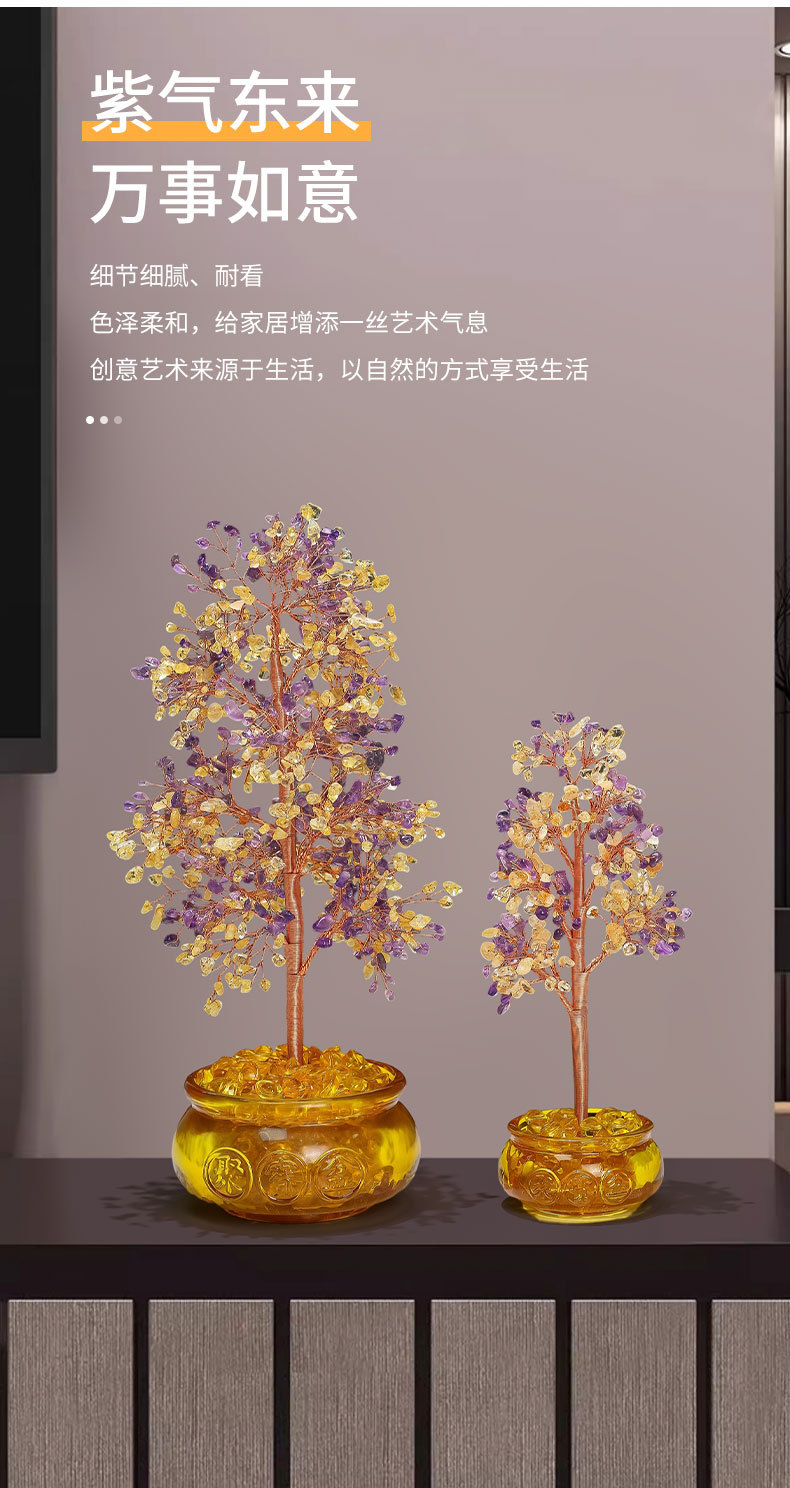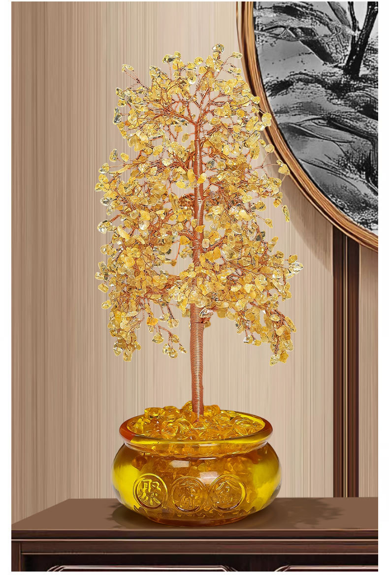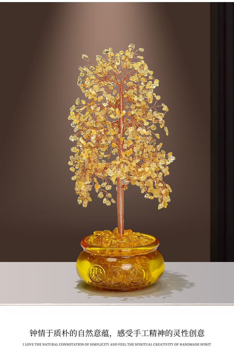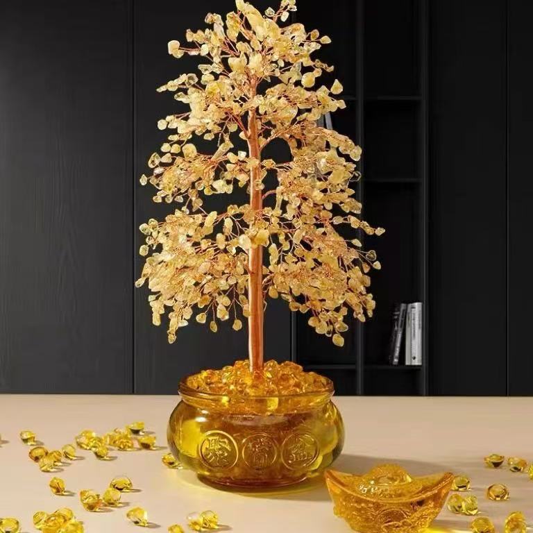 天然黄水晶碎石发财树招财摇钱树摆件家居客厅办公室开业高档礼物