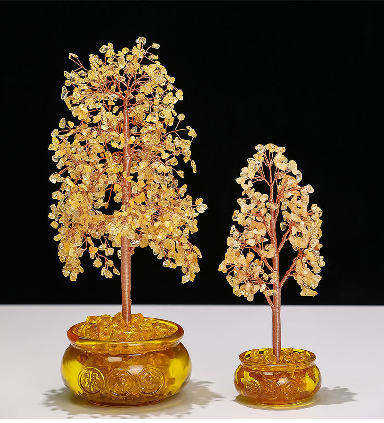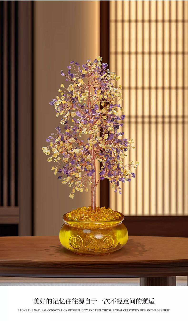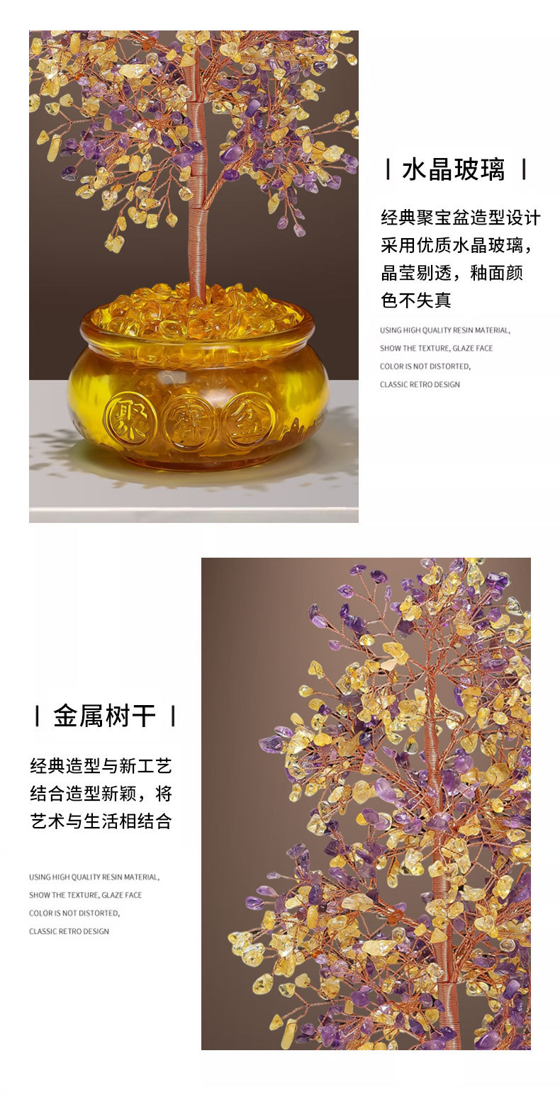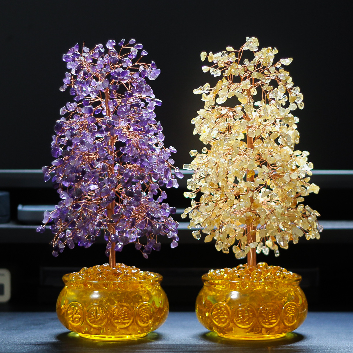 天然黄水晶碎石发财树招财摇钱树摆件家居客厅办公室开业高档礼物