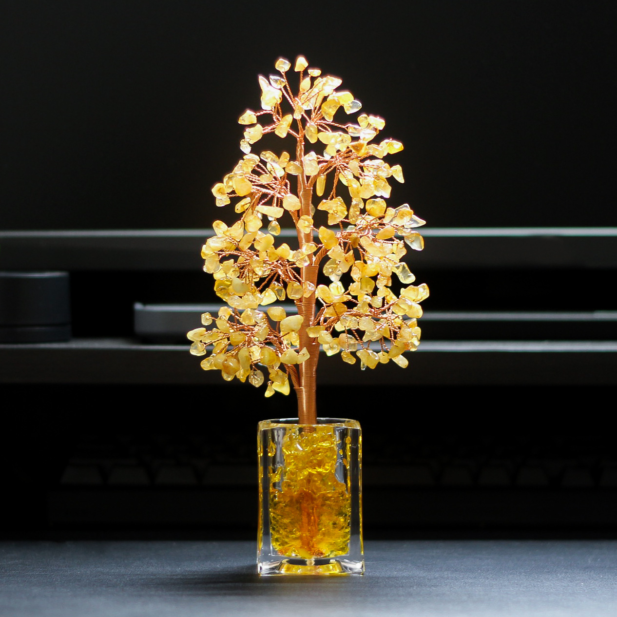 天然水晶の金運の木飾り、イエロークリスタルの招財樹、宝箱、金のなる木、家の装飾、贈り物、新年飾り