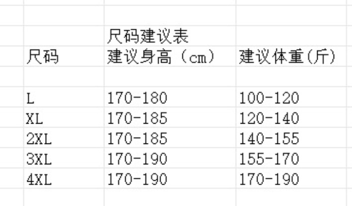 尺码 L(100-120)斤,XL(120-140)斤,2XL(140-155)斤,3XL(155-170)斤,4XL(170-190)斤