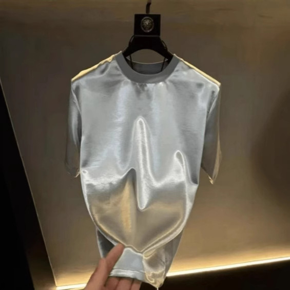 ファッション半袖2025新型メンズ百合半袖丸首カジュアルメンズファッション純色修身酢酸工芸