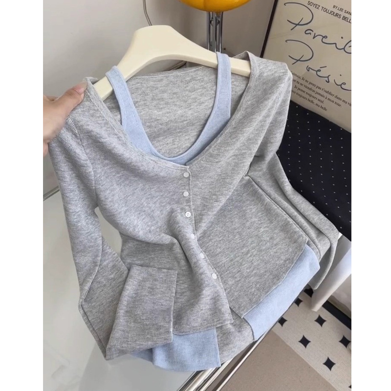 撞色假两件吊带拼接v领针织衫女早秋季新款设计感显瘦打底衫上衣