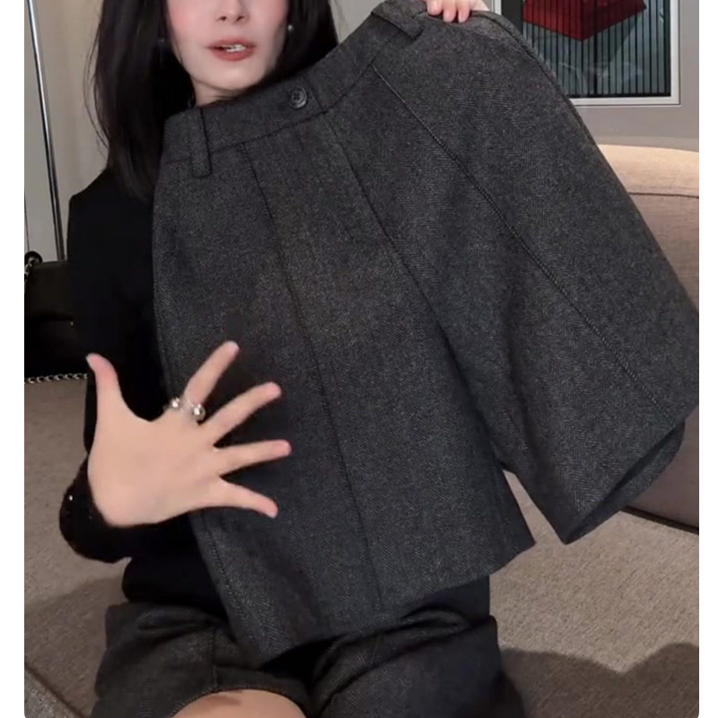 深灰色高JI毛呢休闲五分裤女2025冬季新款小众气质慵懒风阔腿裤子