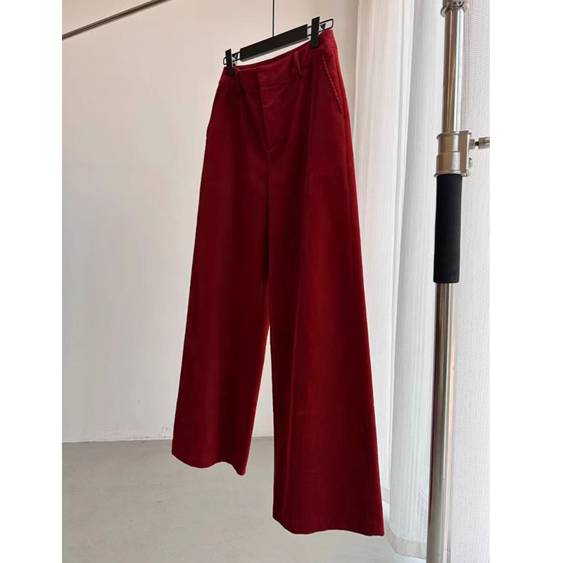 CHAO级推荐!复古红色灯芯绒阔腿裤女秋冬直筒高级感显瘦休闲长裤