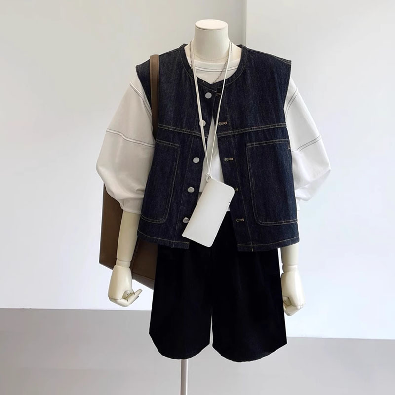 レトロな紺色のデニムの馬甲の女性の春と秋のデザイン感があります。