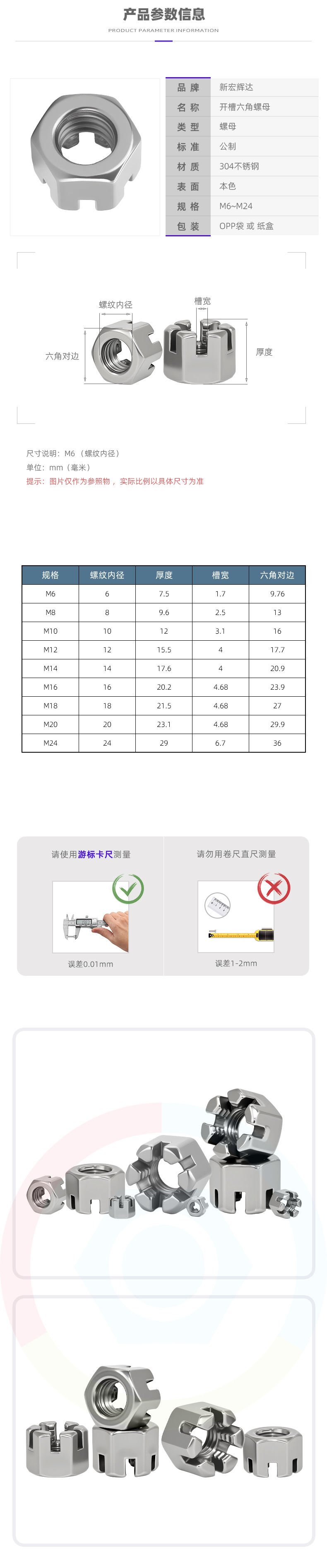 产品规格 M6 [304 六角开槽螺母 GB6178],M8 [304 六角开槽螺母 GB6178],M10 [304 六角开槽螺母 GB6178],M12 [304 六角开槽螺母 GB6178],M14 [304 六角开槽螺母 GB6178],M16 [304 六角开槽螺母 GB6178],M20 [304 六角开槽螺母 GB6178],M24 [304 六角开槽螺母 GB6178]