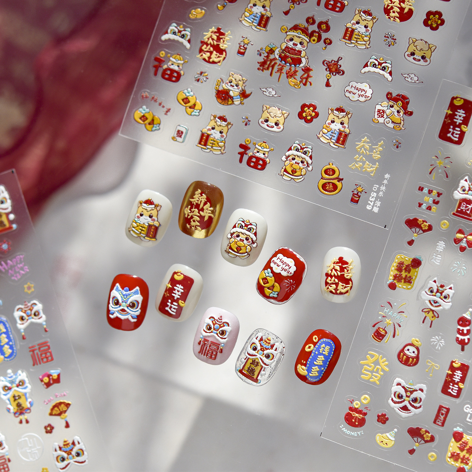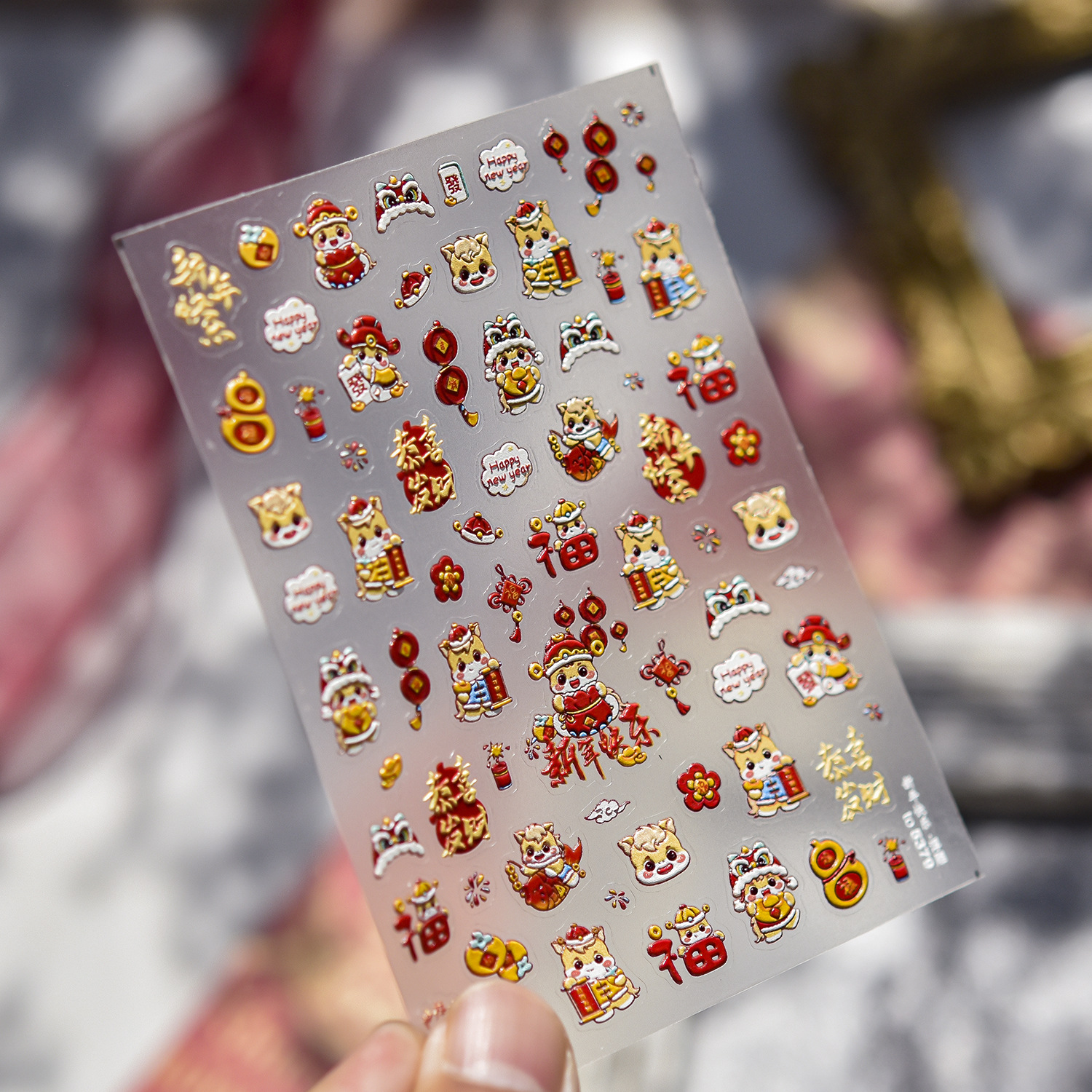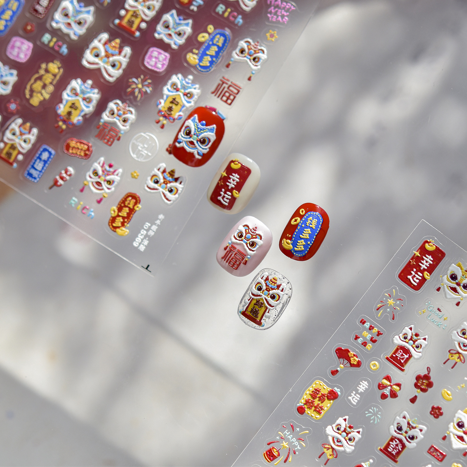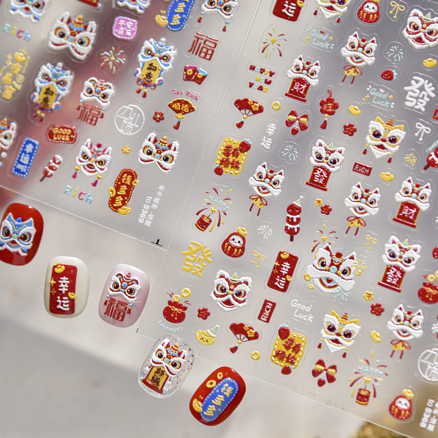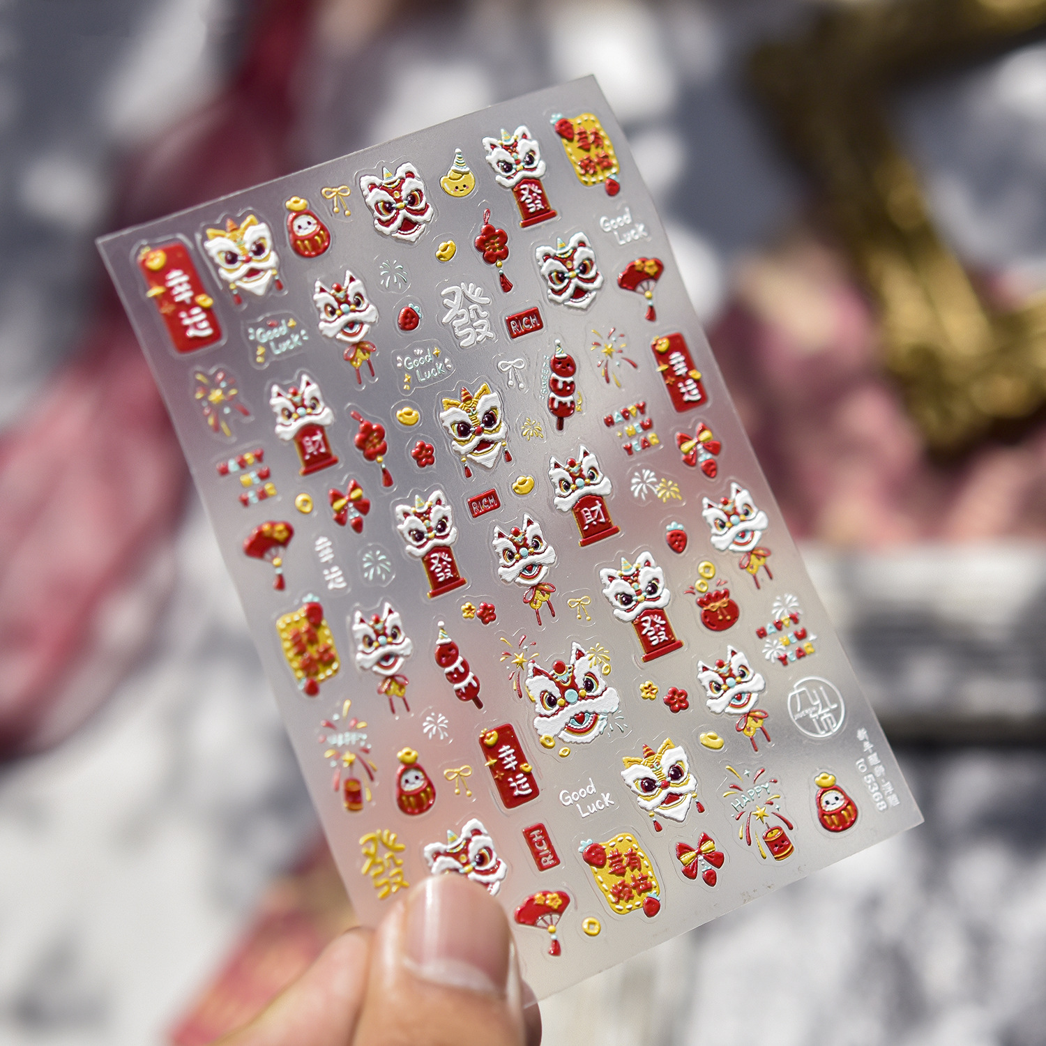 tomoni浮雕美甲贴纸爆款喜庆风国潮风指甲贴新年醒狮饰品贴纸素材