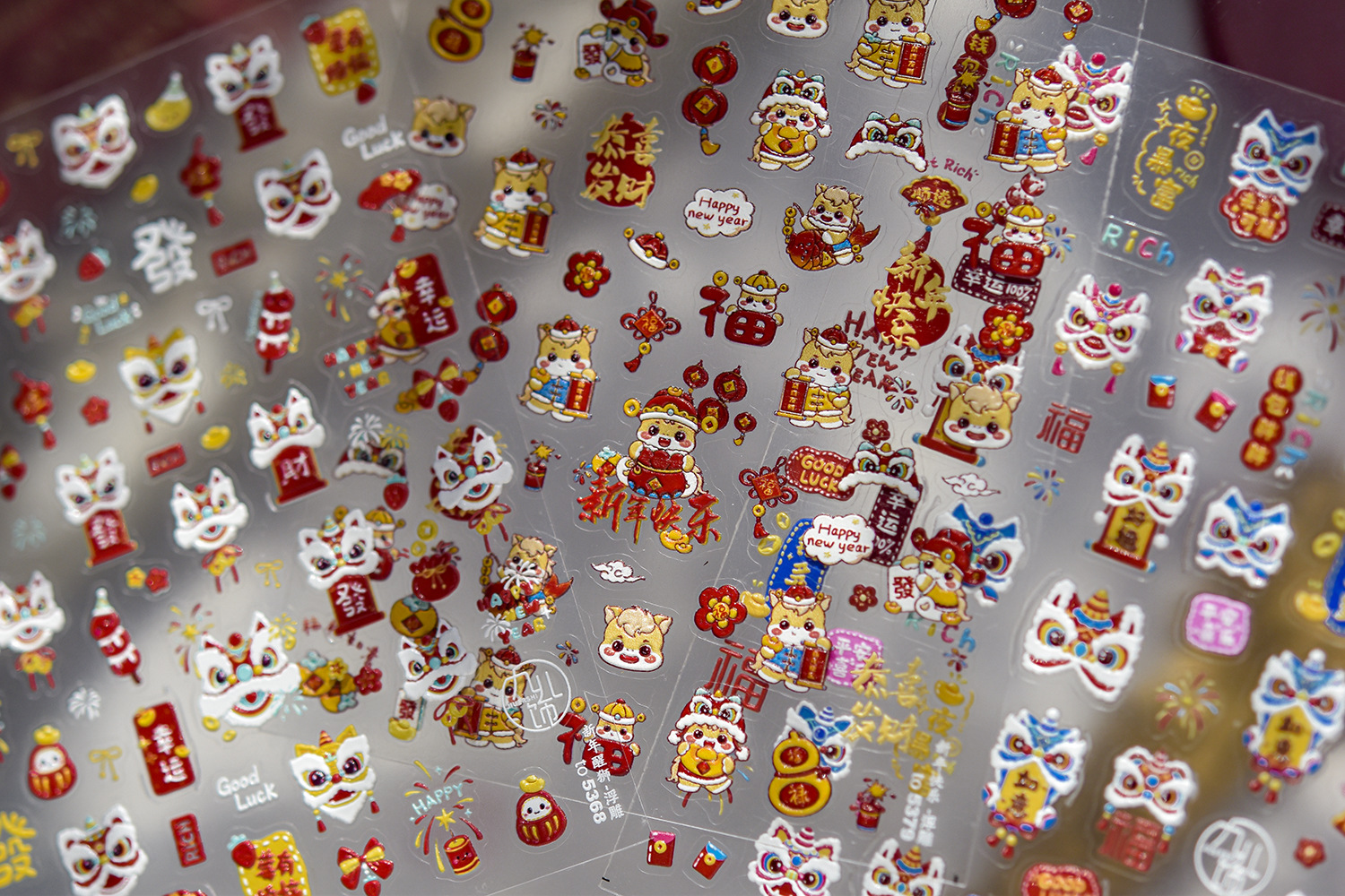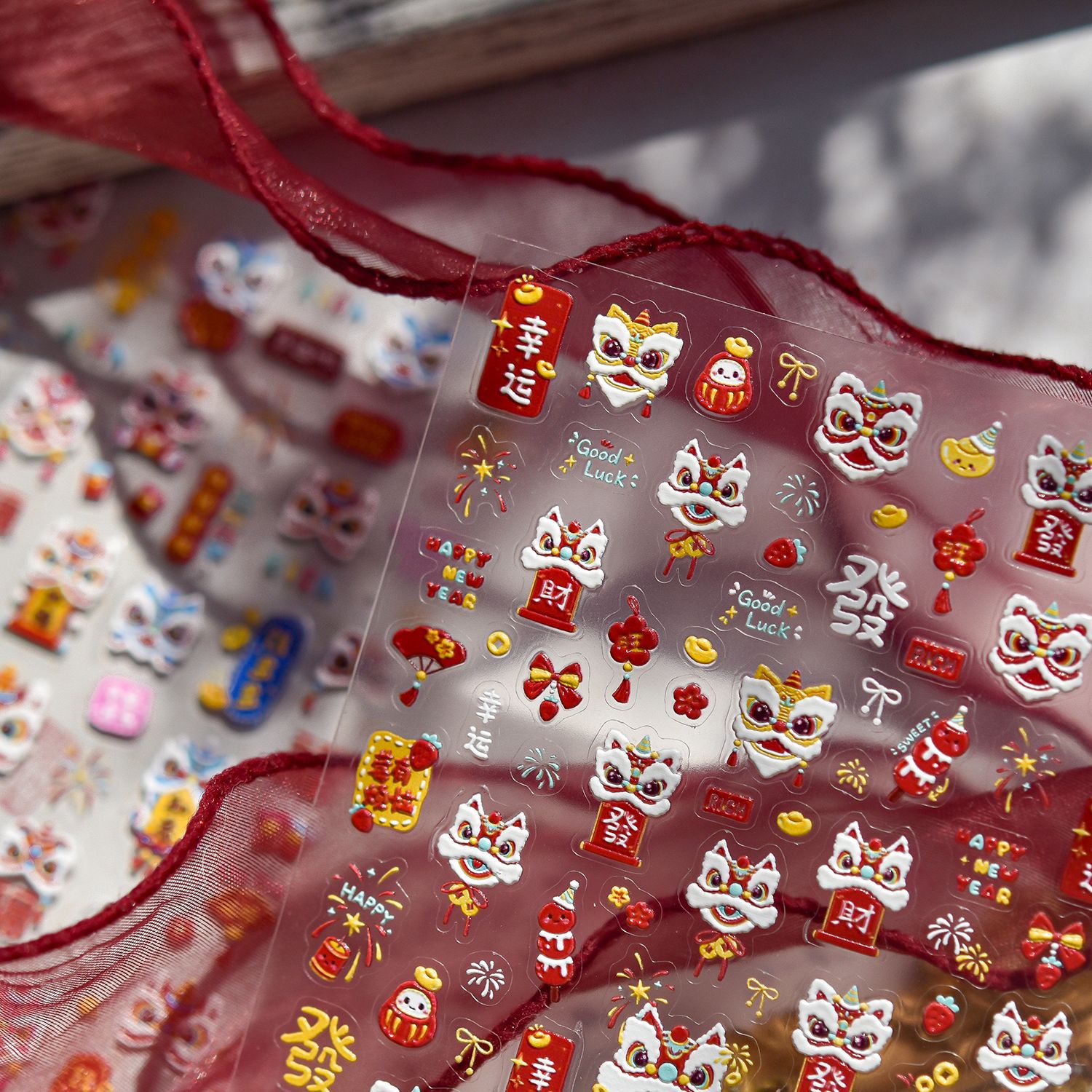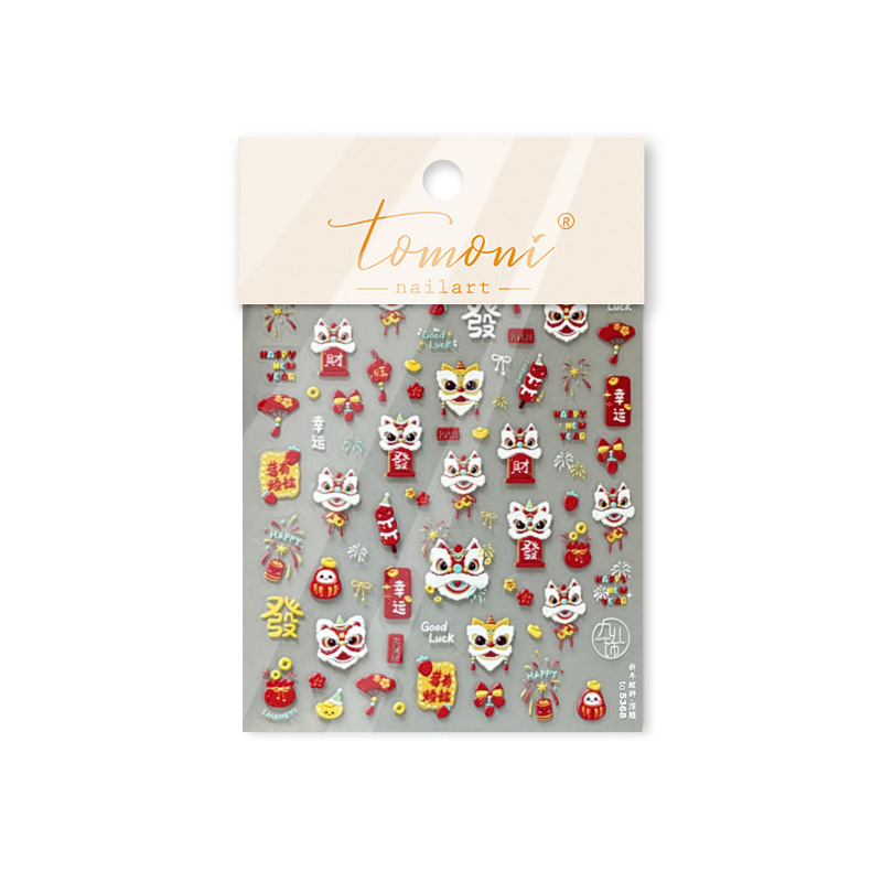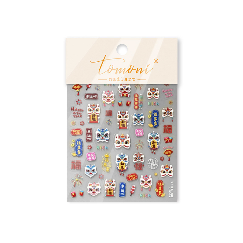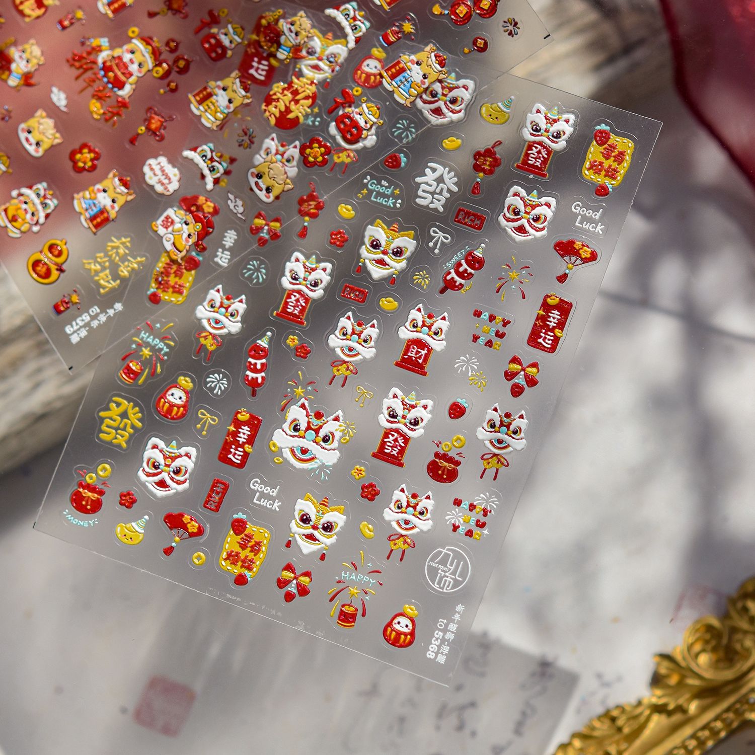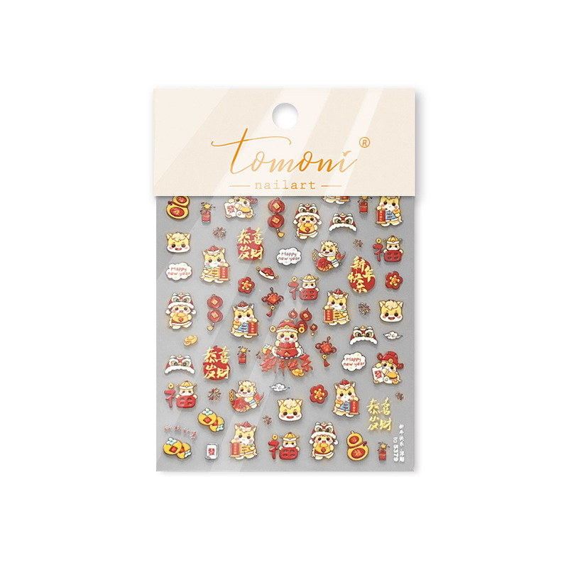 tomoni浮雕美甲贴纸爆款喜庆风国潮风指甲贴新年醒狮饰品贴纸素材
