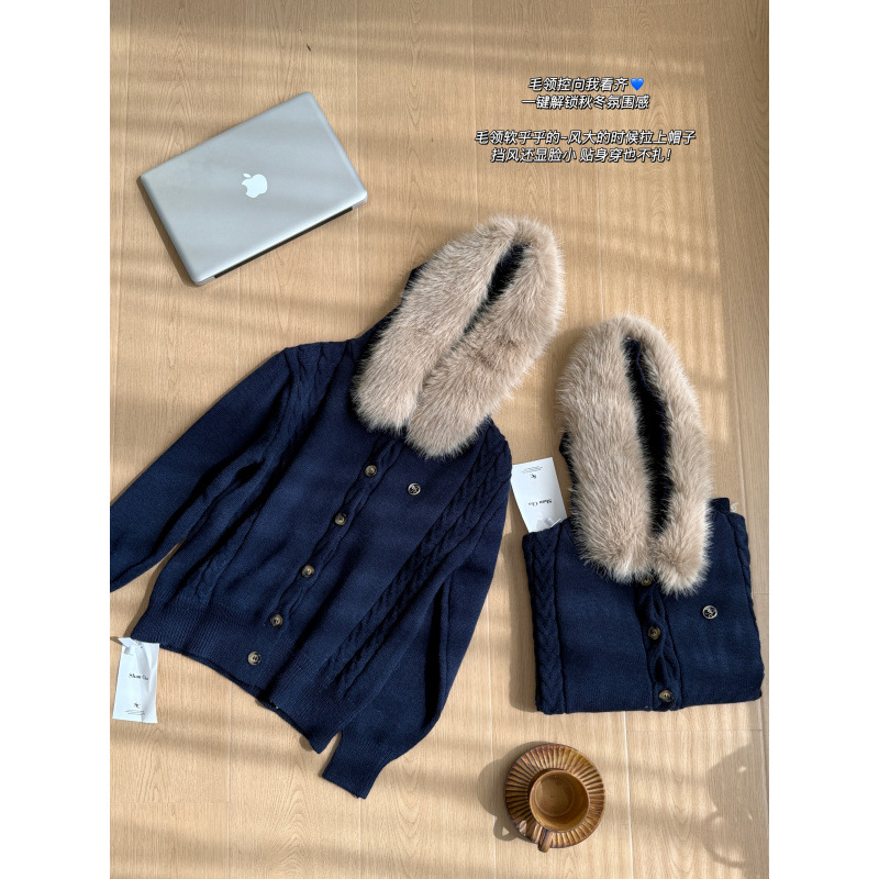 2025乌蘑蓬松保暖毛毛领连帽开衫休闲百搭立体绞花收腰显瘦毛衣