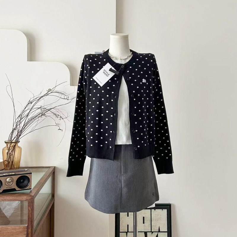 复古波点刺绣圆领假两件打底针织衫2025新款女显瘦开衫毛衣外套