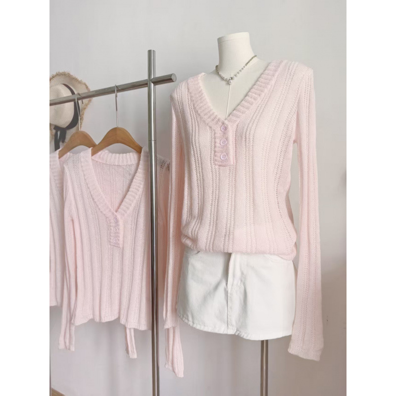 藕粉色V领毛织上衣女2025新款竖坑条螺纹镂空马海毛针织衫