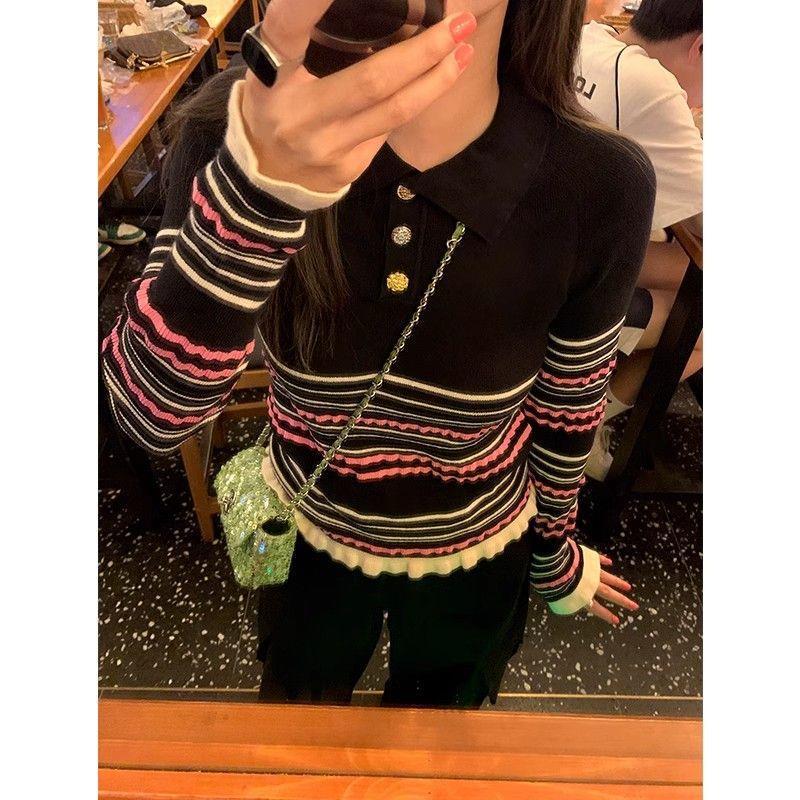 2024秋冬学院風poloニット女性は冬にゆったりと腰を収めて痩せている中にシャツを着て高級感のある上着を着ている