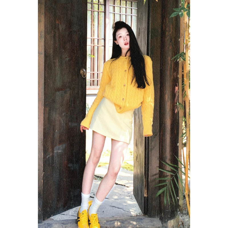 2024黄色の花を絞ってカーディガンを編んだ女性は2024年春に丸首セーターのコートを組み合わせた