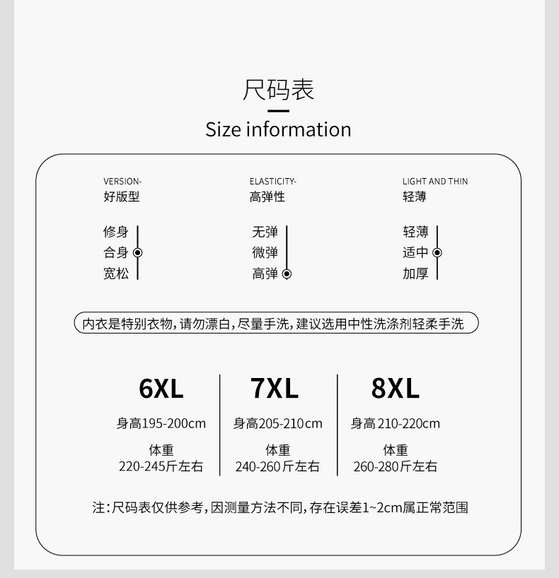 尺码 6xl(190斤-210斤),7Xl(210斤-230斤),8XL(230斤-255斤),4xl(160斤-175斤),5xl(175斤-190斤)