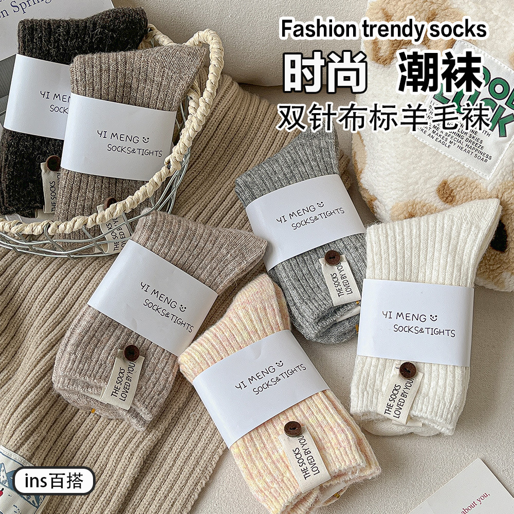 秋冬保暖羊毛袜加厚双针布标中筒袜女堆堆袜时尚ins潮袜子女批发