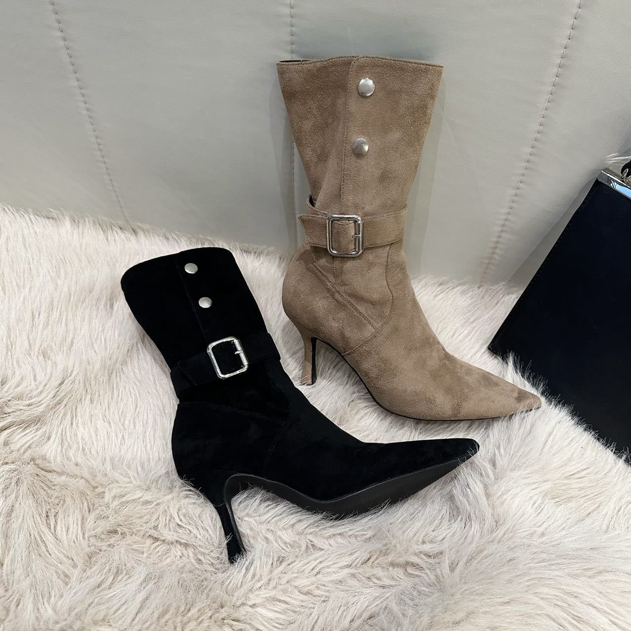 25X3复古风绒面细跟翻折两穿西部牛仔靴女尖头显瘦气质时装靴