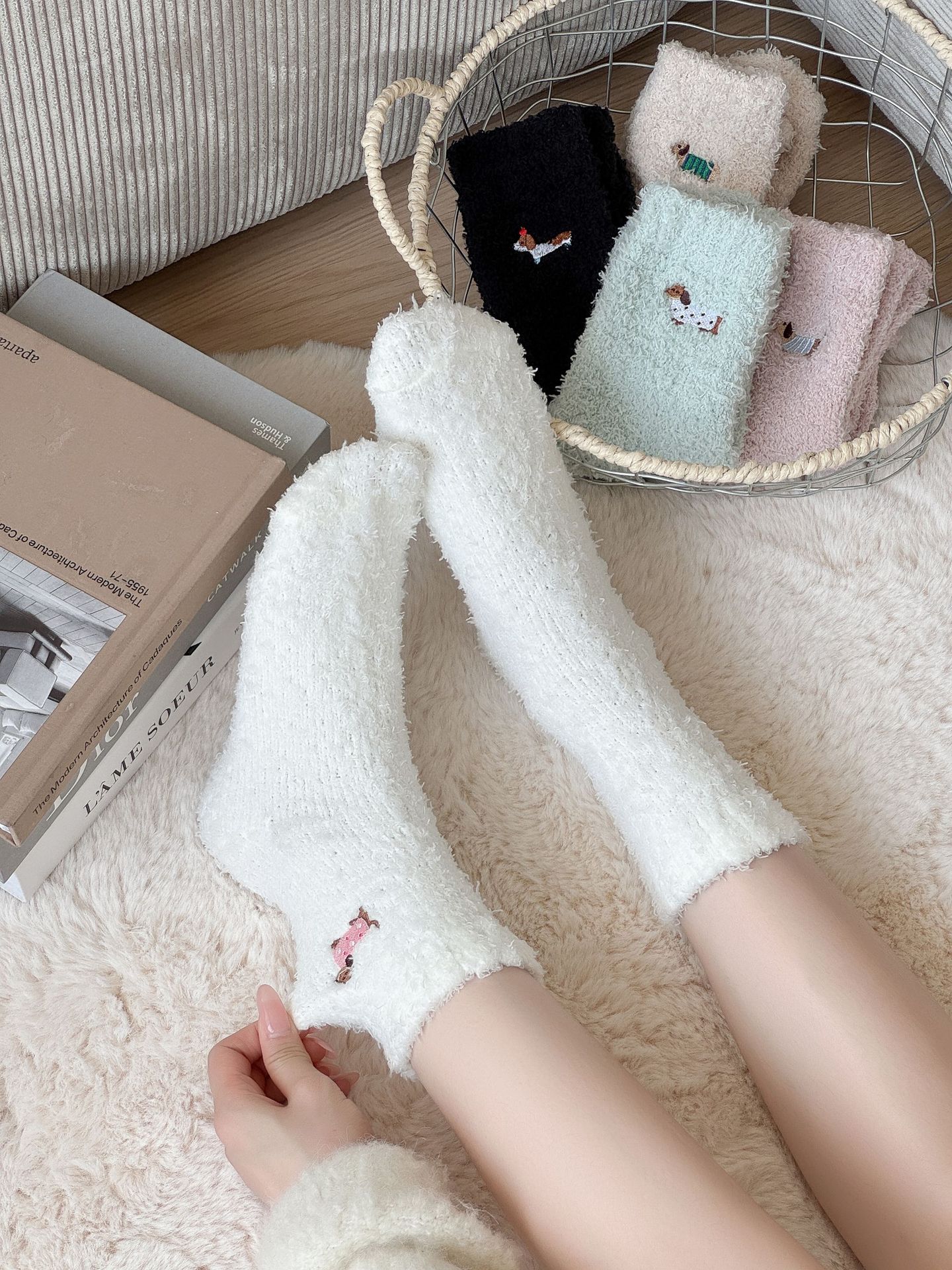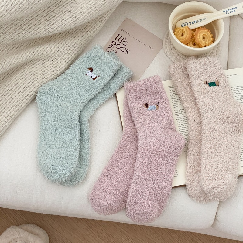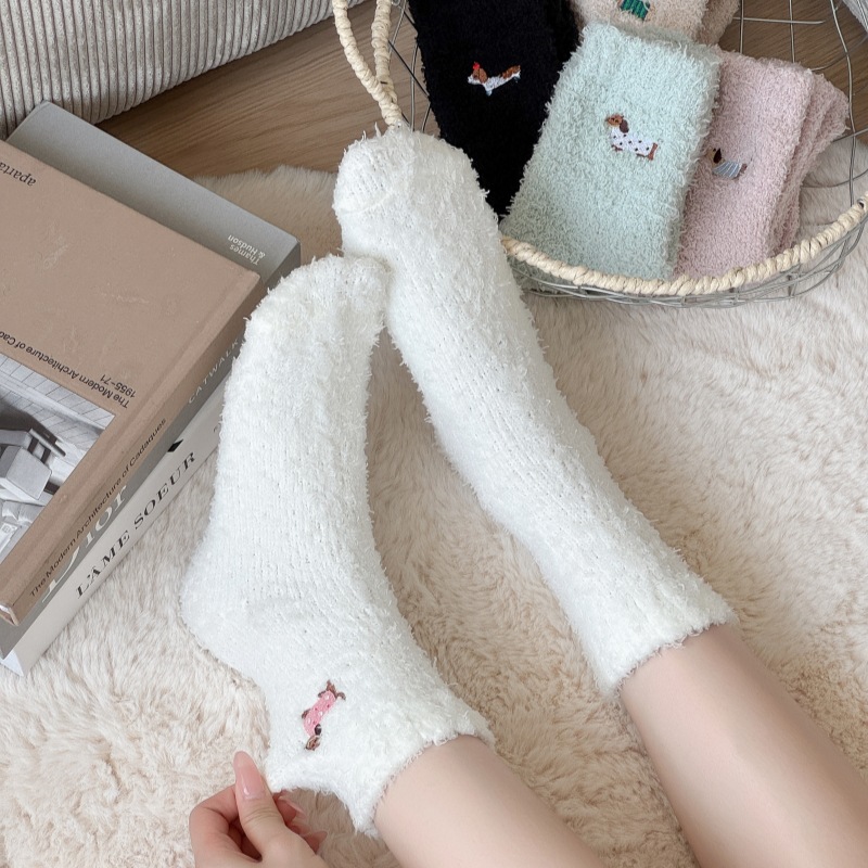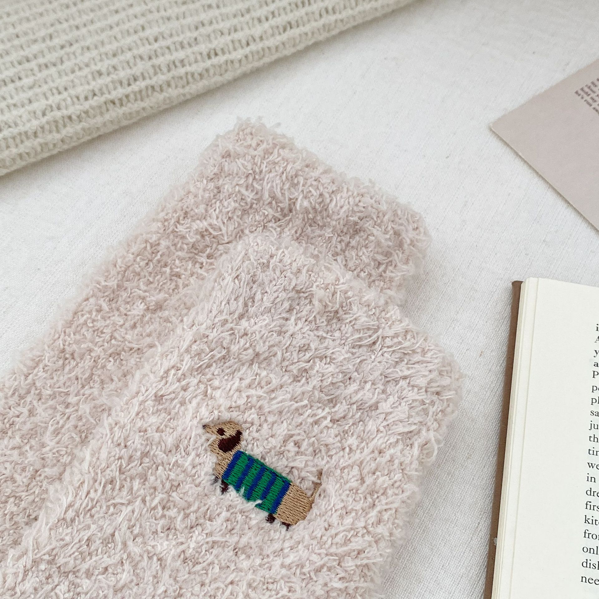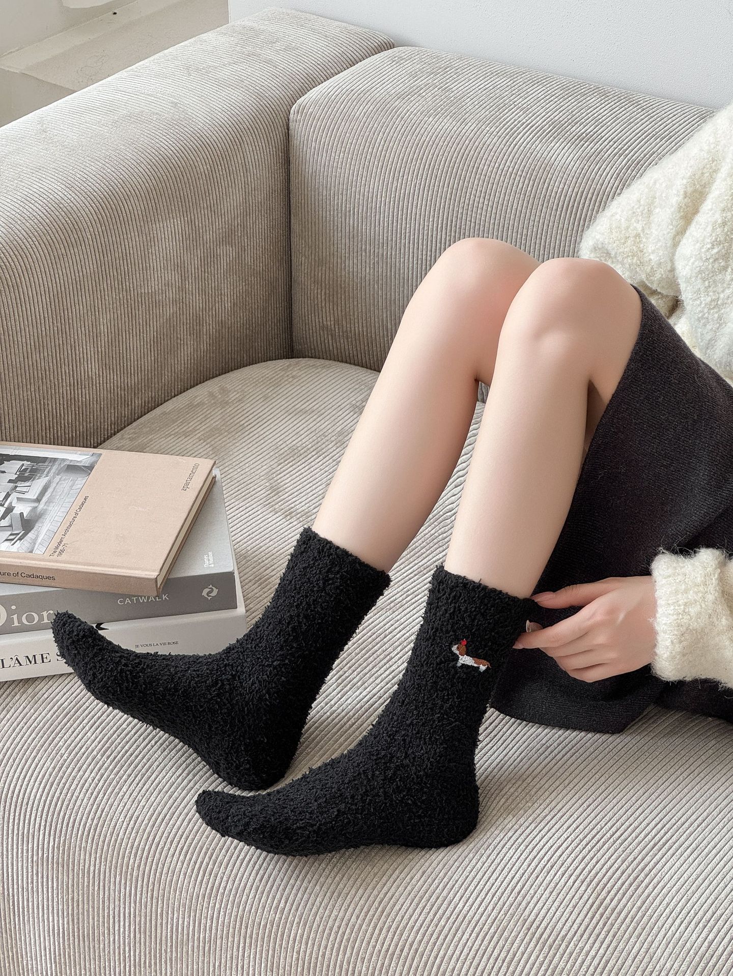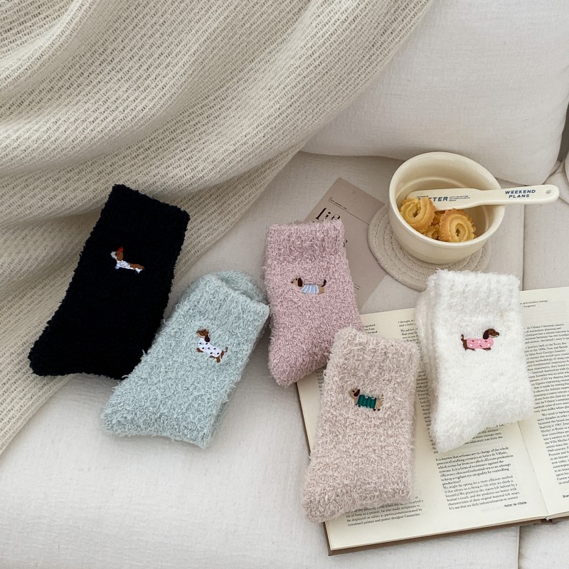 秋冬新款珊瑚绒袜子不掉毛腊肠狗女袜半边绒保暖地板袜fuzzysocks
