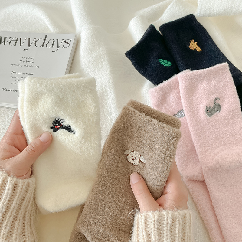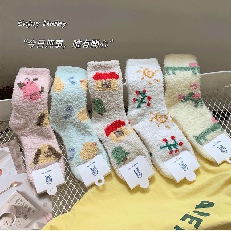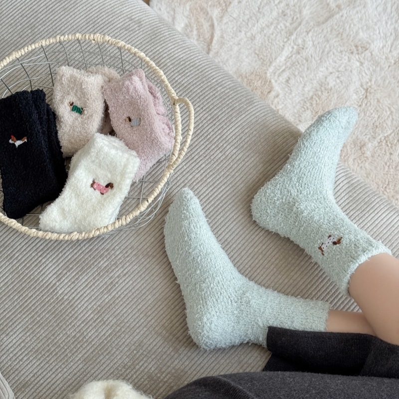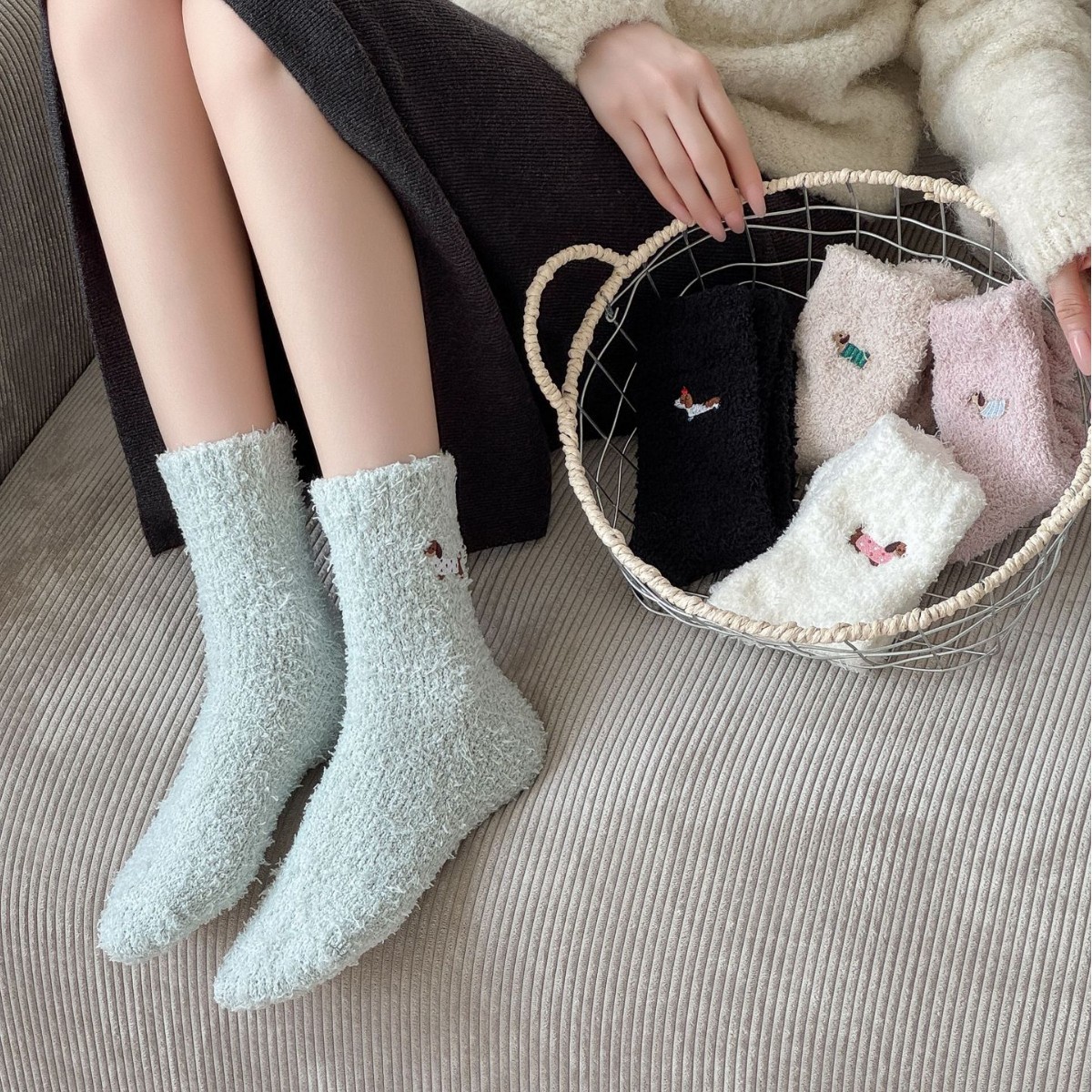 毛抜けないコーラルフリースソックス 女性用 クマ柄ソックス 厚手 あったか ハーフフリース 刺繍入り フロアソックス 漫画柄 寝巻きソックス
